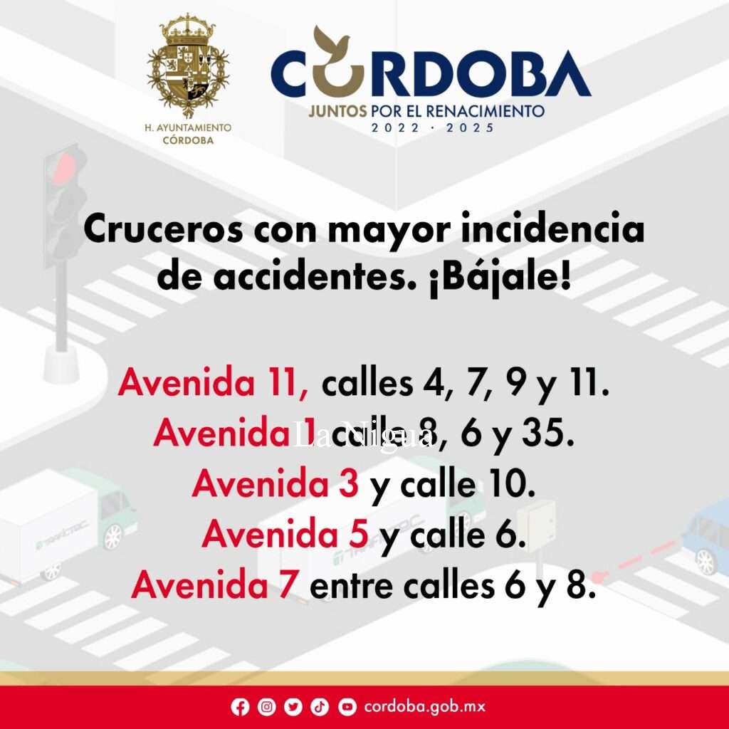 Córdoba, Ver., (11 de abril de 2022). – Durante el primer trimestre del año, en Córdoba se han registrado 275 accidentes viales, de los cuales han resultado 123 lesionados y dos personas fallecidas. De acuerdo con los reportes de la coordinación de Tránsito y Vialidad hay 11 cruceros con mayor incidencia, por lo que piden reducir la velocidad y mantener la distancia.