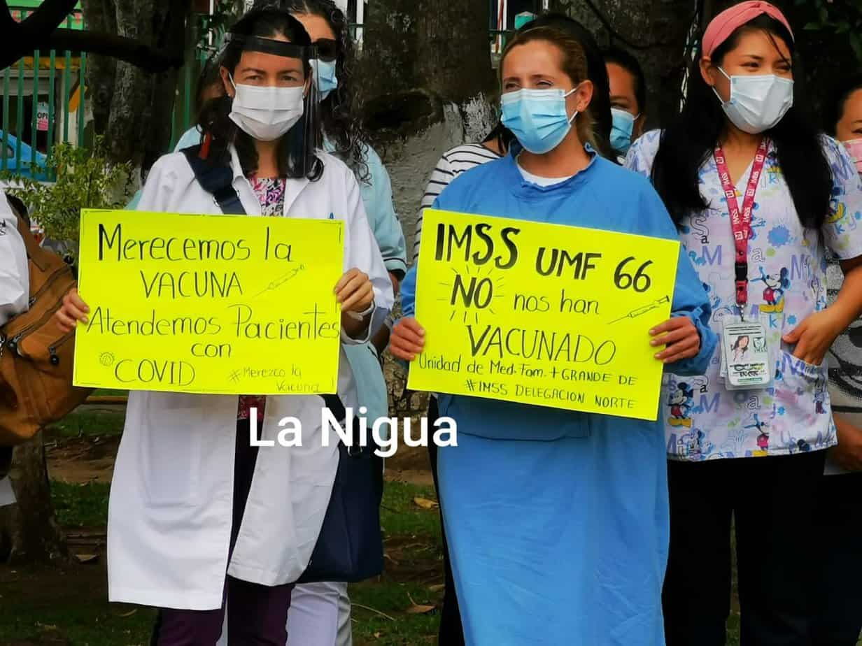 Xalapa, Ver.- En punto de las 13:30 horas de este día de jueves, iniciaron la manifestación personal de salud de la unidad médica familiar 66 del Instituto Mexicano del Seguro Social (IMSS) ,ubicada en la calle Pedro Mora Berinstain s /n de la colonia Salud de esta ciudad de Xalapa, en afueras de este hospital, piden que sean vacunados contra el Covid-19, “Ya que somos una población de 350 trabajadores de la salud y sólo un 5 por ciento ha sido vacunado” así lo manifestó la Doctora Luz Maria Zaragoza.