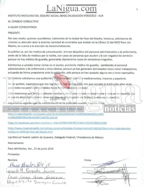 Por este medio, quienes suscribimos, habitantes de la ciudad de Paso del Macho, Veracruz, solicitamos de Ustedes su atención ante la enorme cantidad de anomalías que existen en la Clínica 13 del IMSS Paso del Macho, en cuanto a la atención de derechohabientes.