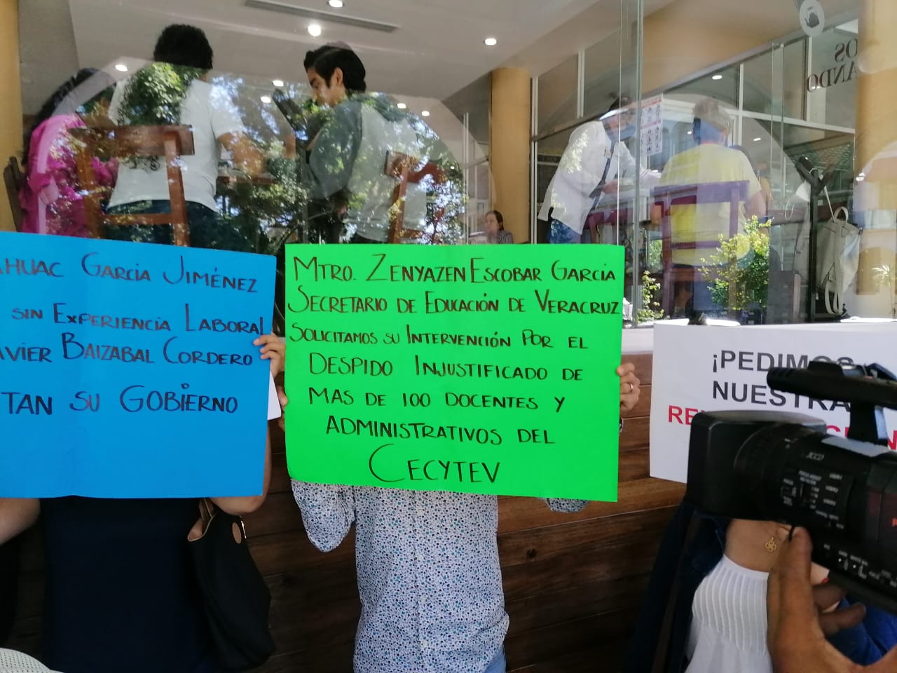 Xalapa, Ver.-Un grupo de Trabajadores del colegio de estudios científicos y técnicos del estado de Veracruz (CECYTEV), en conferencia de prensa, dieron a conocer una denuncia pública en contra del director general, Javier Baizabal Cordero, por el abuso de poder y en donde despidió a 65 trabajadores administrativos y docentes de varios planteles educativos y de diferentes áreas de oficinas centrales sin motivo alguno, esto es una violación a nuestros derechos humanos, ya que conforme a la ley federal del trabajo establece que en el momento del despido debe darnos a conocer por escrito los motivos del despido en total somos 65 despedidos en menos de un año, así lo manifestó, Fernando Martel Luna trabajador despedido del plantel del municipio de Atzalan.