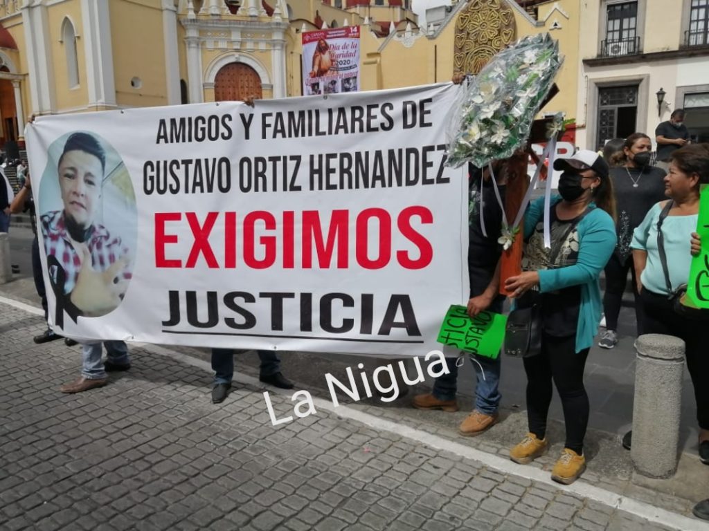 Los familiares portaban una cruz de madera, flores y una lona grande con el rostro de Gustavo, señalaron, que este día que salieron del domicilio particular en donde vivía Gustavo, con dirección a esta plaza Lerdo y durante el trayecto siempre fuimos intimidados por elementos de la secretaría de seguridad pública del estado de Veracruz (SSP) abordó de dos patrullas, ya que este día se cumplen los nueve días del asesinato de Gustavo. Ortiz Hernández, venimos a pedir justicia, así también piden seguridad para ellos ya que han sido objeto de intimidaciones.