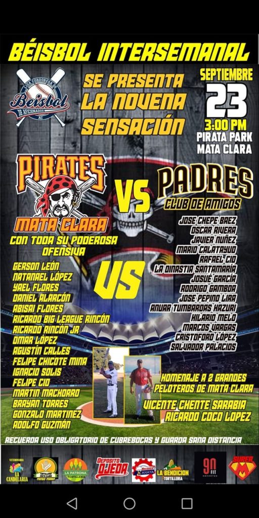 Fito Guzmán, uno de los pilares de los Piratas de Mata Clara, dijo a Nuevo Sol que en el juego de la temporada de beisbol intersemanal de la Liga Cordobesa de éste jueves se llevará a cabo el reconocimiento a dos de los peloteros más importantes del equipo, como lo son Ricardo “Coco” López y Vicente “Chente” Sarabia.