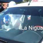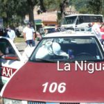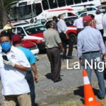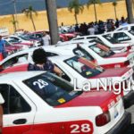 Durante horas taxistas y conductores de autobuses formaron sus unidades para que fueran sanitizadas una vez que esto sucedió se colocó una calcomanía en su vehículo.