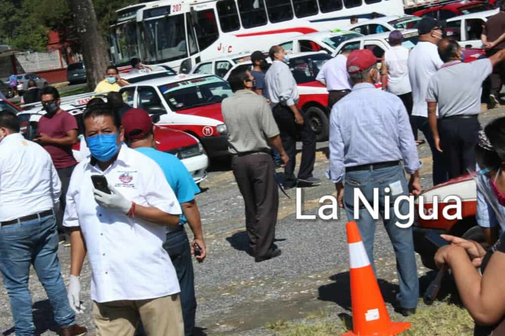 Durante horas taxistas y conductores de autobuses formaron sus unidades para que fueran sanitizadas una vez que esto sucedió se colocó una calcomanía en su vehículo.
