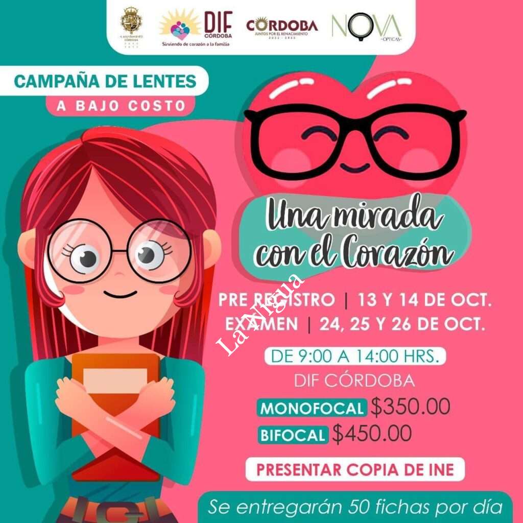 Córdoba, Ver.- El DIF Municipal, con el objetivo de apoyar a la población, pondrá en marcha la campaña de lentes a bajo costo “Una Mirada con el Corazón”, la cual se desarrollará este mes de octubre.