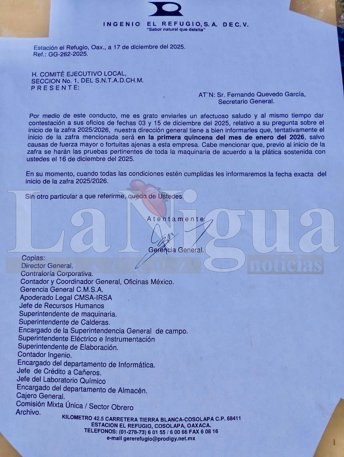 En el documento, la Gerencia General del Ingenio El Refugio precisa que la fecha señalada es tentativa y podría modificarse únicamente por causas de fuerza mayor o fortuitas ajenas a la empresa. Asimismo, se establece que antes del inicio de la zafra se llevarán a cabo los preparativos y ajustes necesarios en toda la maquinaria, conforme a lo acordado en la reunión sostenida entre ambas partes el 16 de diciembre de 2025.