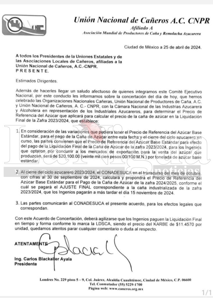 Se ha dado a conocer la circular de la Unión Nacional de Cañeros AC, donde en conjunto con la Cámara Nacional de las Industrias Azucarera y alcoholera han determinado el precio de referencia.