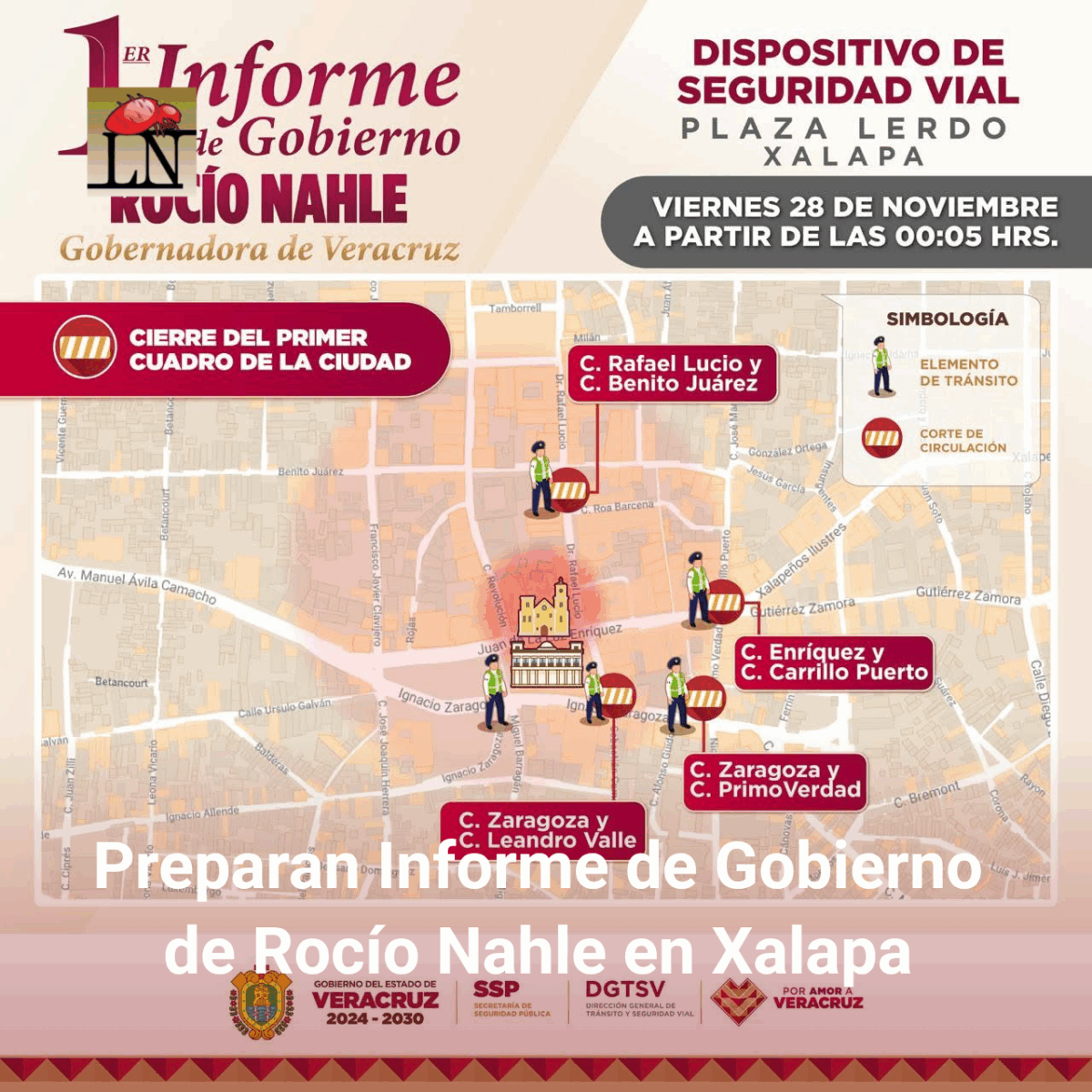 Xalapa, Ver.- La Dirección General de Tránsito y Seguridad Vial de la Secretaría de Seguridad Pública (SSP) informó que, a partir del primer minuto de este viernes 28 de noviembre, se aplicará un corte total a la circulación en diversas calles del primer cuadro de la ciudad de Xalapa debido a la instalación del operativo especial para el primer informe de labores de la gobernadora de Veracruz, Rocío Nahle García.