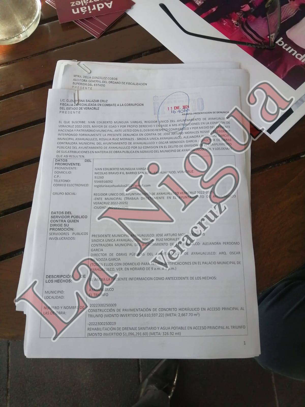 Xalapa, Ver.- El regidor único del ayuntamiento de Ayahualulco, Iván Edilberto Munguia Vargas, en conferencia de prensa, dijo, que presentó el día de ayer 11 de enero, las denuncias correspondientes en la auditoría general del Órgano de Fiscalización Superior del Estado ( ORFIS), Fiscalía Especializada en Combate a la Corrupción del estado de Veracruz y Contraloría General del estado de Veracruz, en contra del presidente municipal, José Arturo Morales Rosas, ya que existe obra pública, pero a un año de su construcción ya presentan daños, en guarniciones, banquetas y tapas de registro en la localidad de El Triunfo, representan un daño patrimonial, en esta misma localidad en menos de dos años se le han invertido más de doce millones de pesos, pero la más grande demanda de los casi 2500 habitantes es el suministro de agua potable.