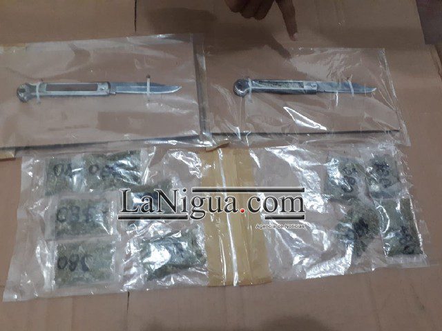 Al momento, de realizar una revisión corporal, se les decomisaron dos armas blancas así como varias bolsitas, conteniendo en su interior marihuana.