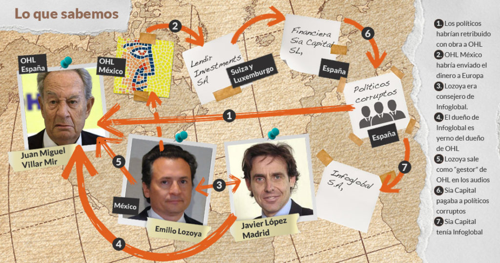 La constructora OHL lleva cuatro años siendo investigada en España por el presunto pago de dinero a funcionarios de ese país a cambio de licitaciones. El escándalo de corrupción implica a sus directivos, políticos y hasta su filial en México, que según unos audios filtrados en 2015, operó bajo el mismo esquema e involucra a integrantes del Gabinete del sexenio pasado: Emilio Lozoya, Gerardo Ruiz Esparza y Enrique Ochoa Reza, además de los ex gobernadores priistas Arturo Montiel, Enrique Peña Nieto y Eruviel Ávila.