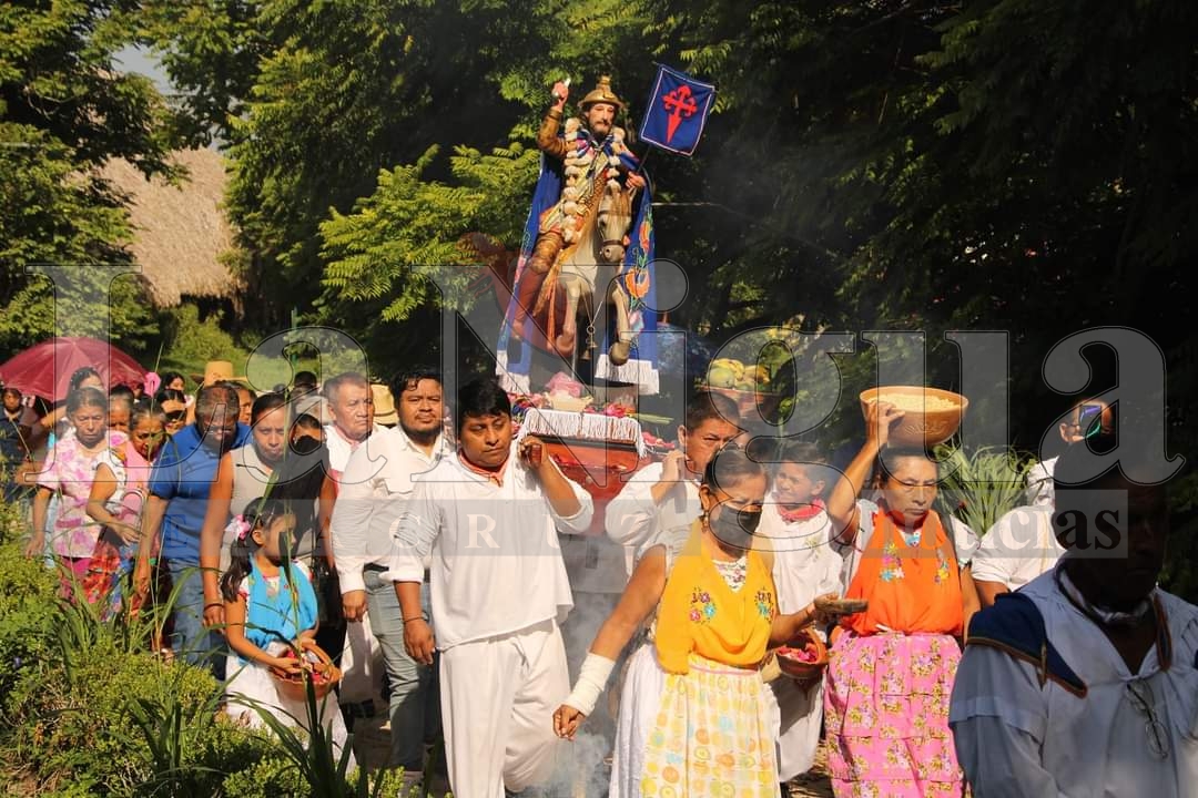 EL TAJIN, VER.— Una auténtica celebración tanto autóctona como religiosa marcó el regreso de la imagen del Santo Patrón Santiago Apóstol al Parque Temático TALKHISKUTH, en Papantla. Tras 60 años de ausencia, la venerada imagen, que también es muy apreciada en el municipio de Coatzintla, emprendió un recorrido procesional entre ambos municipios.