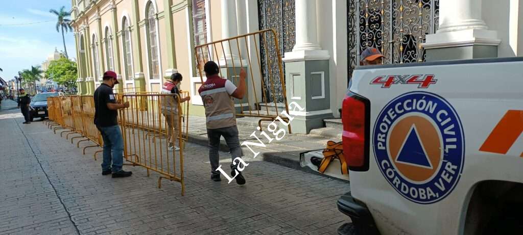 Córdoba, Ver., (9 de julio de 2022).- La Unidad Municipal de Protección Civil (UMPC) redujo a un carril la avenida 1 entre calles 1 y 2 debido al desprendimiento de una parte de la cornisa del Palacio Municipal, por lo que se pide tomar precauciones.