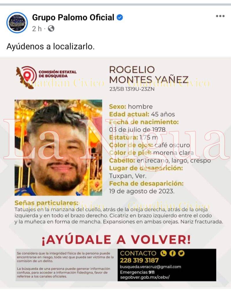 Tras confirmar, la Comisión Estatal de Búsqueda de Veracruz, cuyo organismo gubernamental emitiera, la ficha de localización de ROGELIO MONTES YAÑEZ, quien integrante del Grupo Musical “PALOMO”.