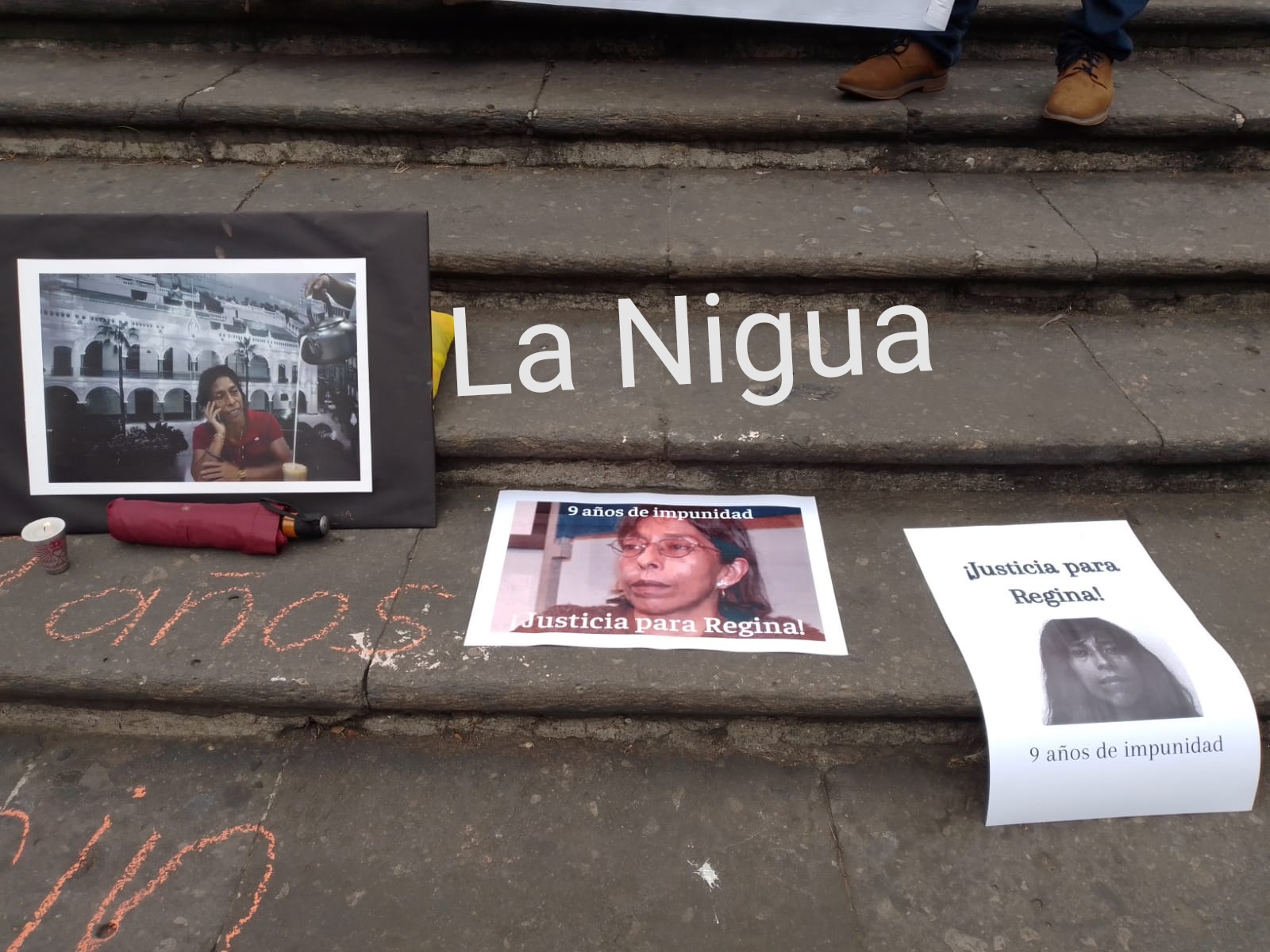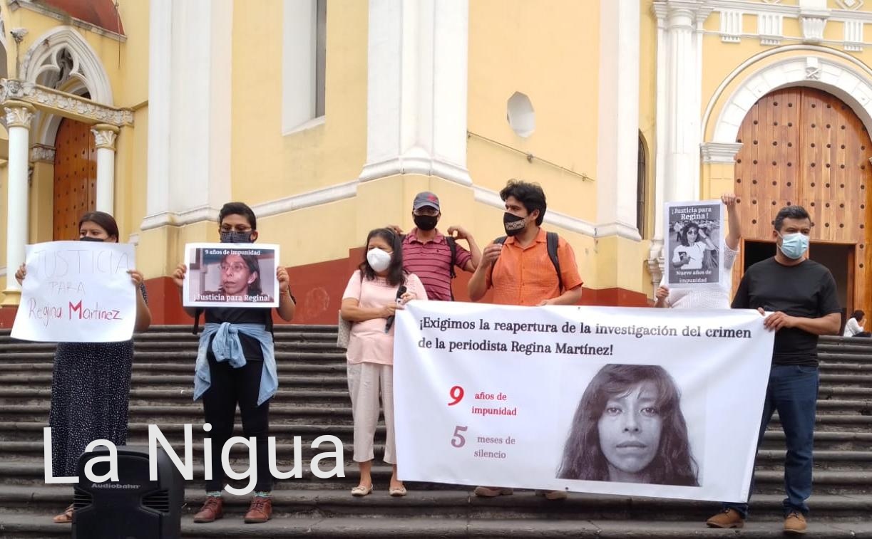 Esta mañana de miércoles reporteros de diferentes medios de comunicación, realizaron un mitin en la Plaza Lerdo ( Ahora Plaza Regina), para recordar el asesinato de la periodista corresponsal de la revista proceso en el estado de Veracruz Regina Martínez, van nueve años en la impunidad, ninguna autoridad tanto federal y estatal han hecho por resolver este crimen, las autoridades en su momento de la procuraduria general del estado de Veracruz, desde que fue encontrada en su domicilio particular y confirmó que se trataba de un crimen pasional y sin necesidad de investigar su trabajo periodístico, el desorden y la falta de investigación que hizo el ministerio público quedó evidenciado cuando el grupo águila siete de la agencia de investigaciones fue enviada a las calles aledañas del domicilio de la periodista y en su recorrido se encontraron con una persona que daría sustento en la acusación en contra de José Adrián Hernández Domínguez alias ” El Jarocho” y supuesto cómplice Jorge Antonio Hernández Silva ” El Silva”, quien ya había sido sentenciado en el año 2014 a 38 años de prisión por homicidio calificado y robo agramado, así lo manifestó la periodista Norma Trujillo Báez.