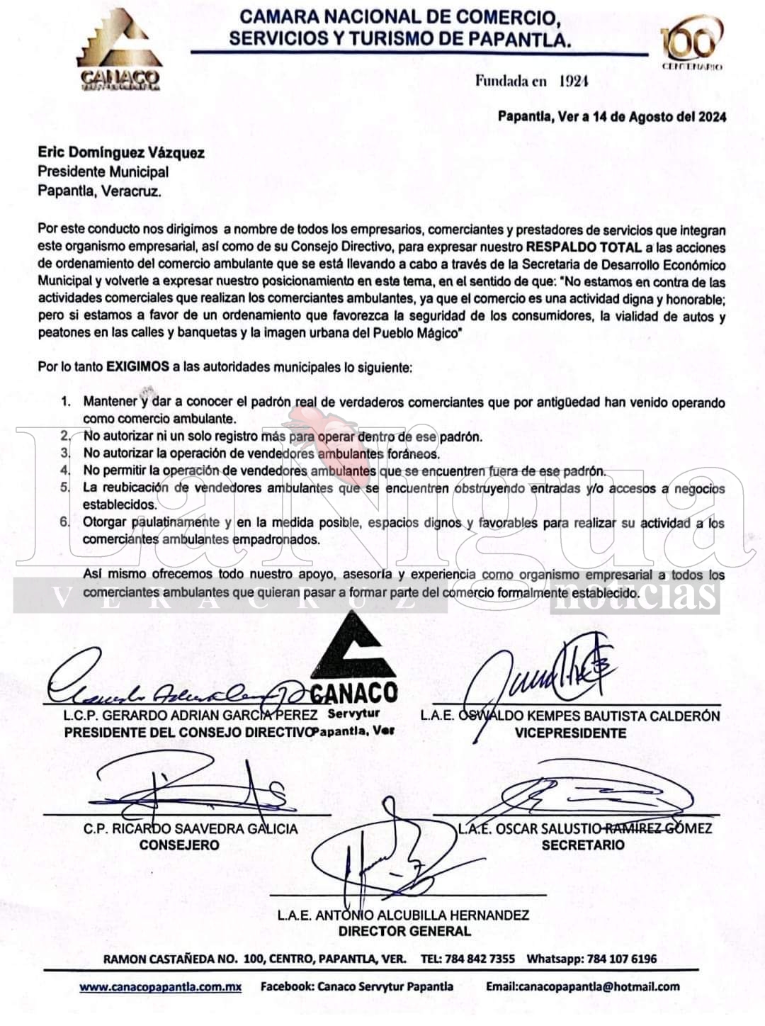 PAPANTLA, VER.- (15 de agosto de 2024). — Luego del reciente anuncio del Gobierno Municipal sobre el ordenamiento de más de 500 comerciantes informales a través de un código QR, la Cámara Nacional de Comercio (CANACO) ha expresado su apoyo a estas nuevas medidas implementadas por la Secretaría de Desarrollo Económico del Gobierno Municipal. Sin embargo, estas acciones no han sido bien recibidas por algunos líderes del comercio informal.