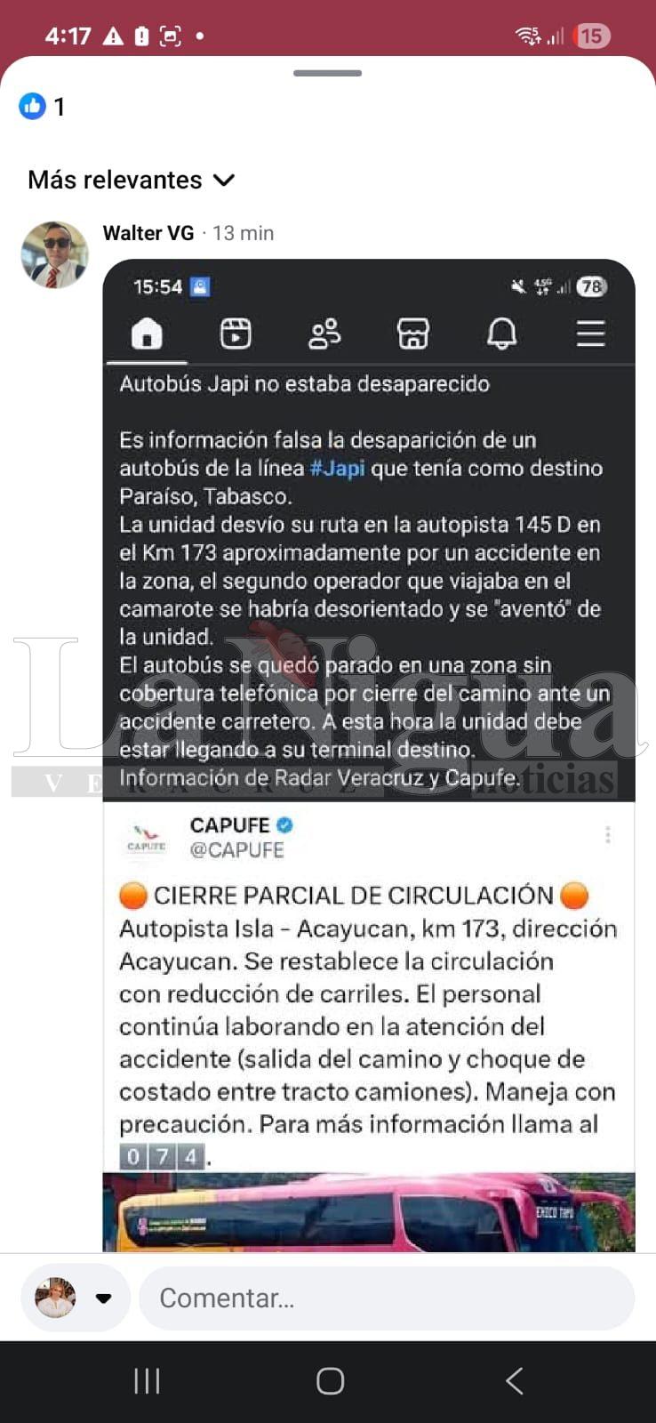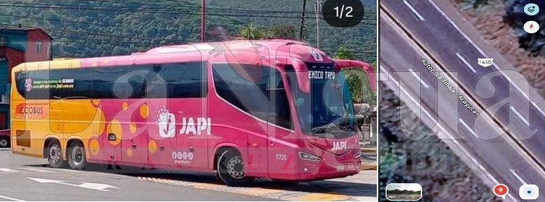 ACAYUCAN, VER. – Un autobús de turismo de la empresa Japi, modelo Irizar i8, número económico 5729 color rosa con amarillo, se extravió de manera extraña desde las 3 de la mañana cuando los pasajeros que partieron de la Ciudad de México con destino a Paraíso, Tabasco, dejaron de comunicarse con sus familiares, luego de mostrar mensajes de alerta, de que algo extraño estaba pasando, cuando circulaban a la altura de entre la caseta de Cosamaloapan y Acayucan, zona de constante inseguridad y accidentes.