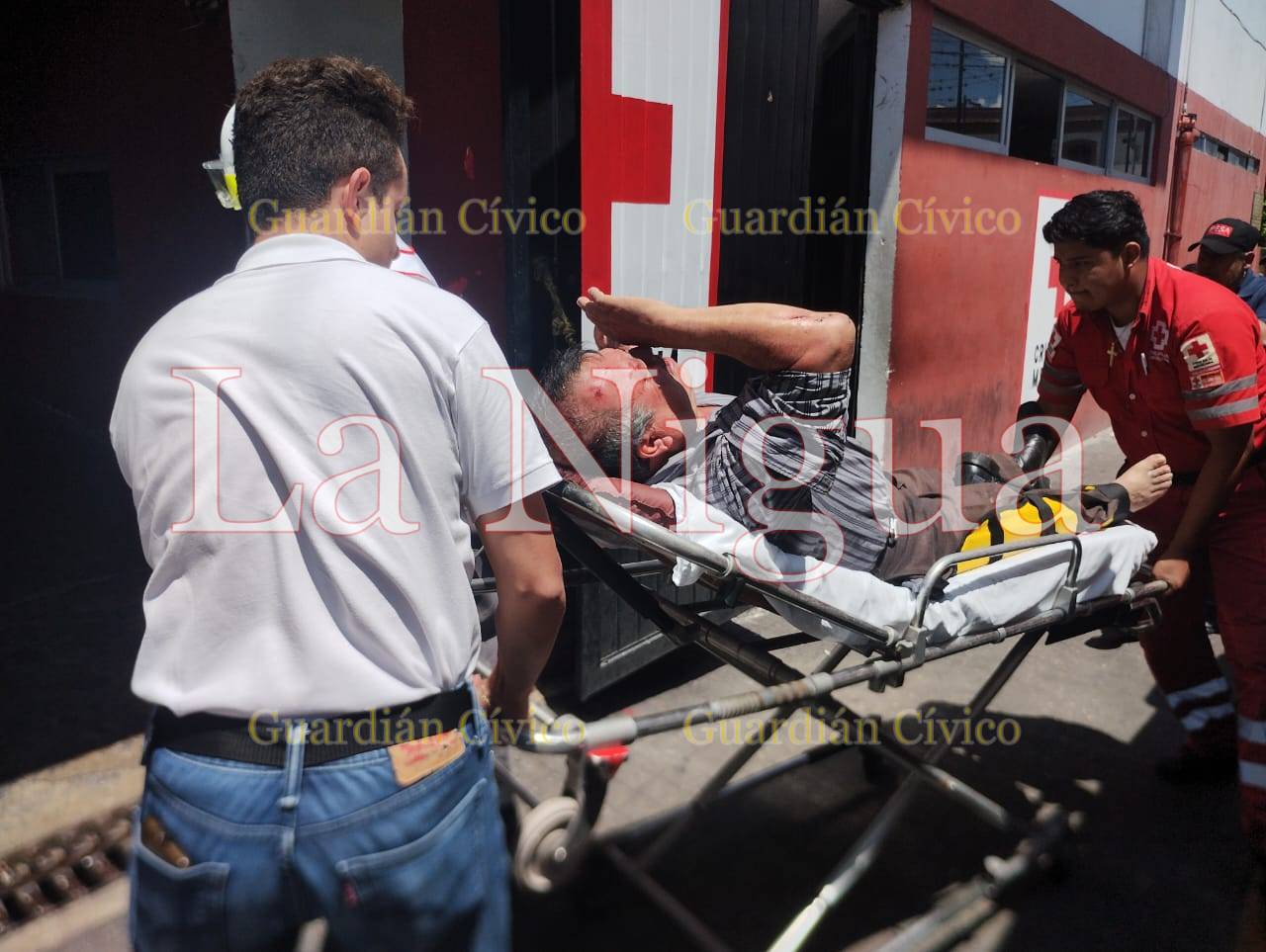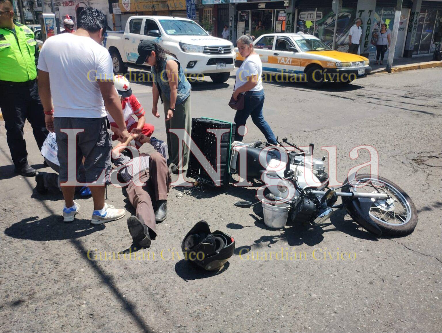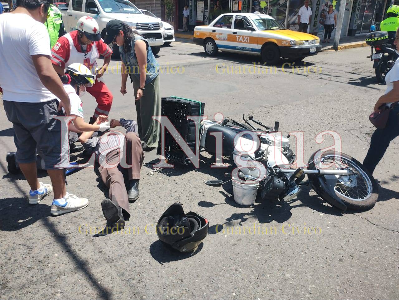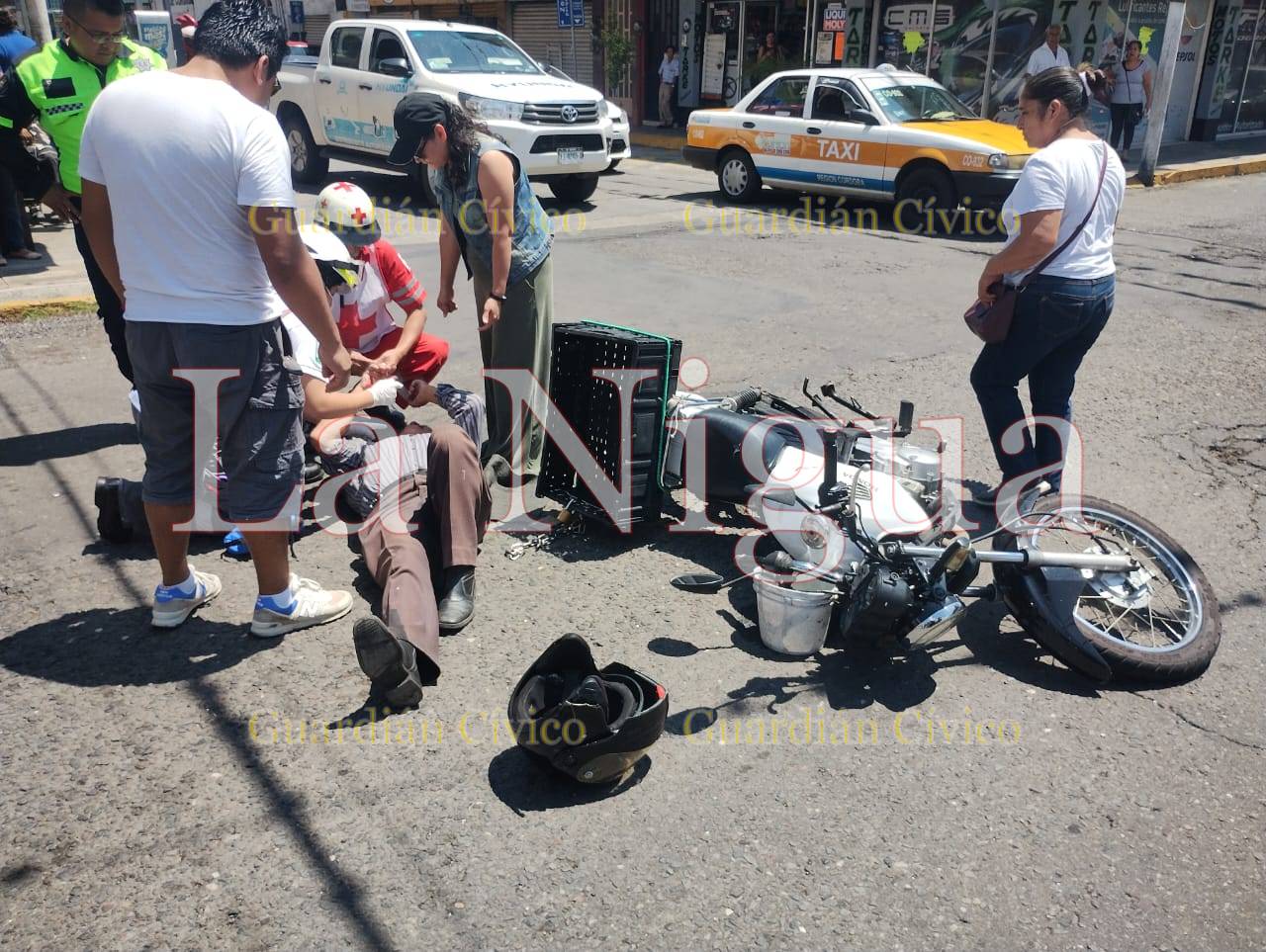Córdoba, Ver.- Un motociclista identificado como Félix Trejo, tuvo que ser auxiliado por paramédicos de la Cruz Roja y enviado a un hospital para atención médica, debido a que la motocicleta Honda en la cual se desplazaba, fue impactada por un vehículo Nissan-Platina cuyo conductor no respetó la preferencia vehicular en el cruce de la avenida 5 con calle 15 en la colonia Centro.
