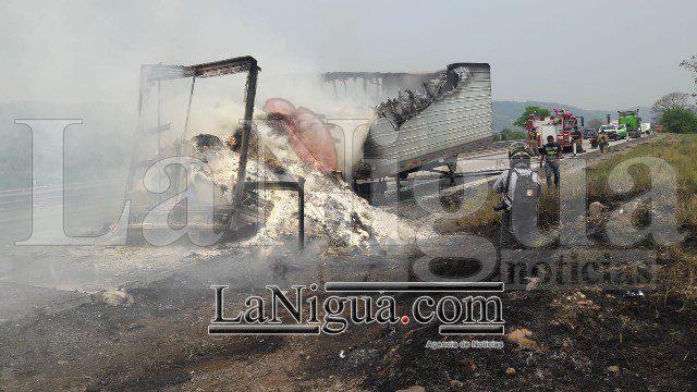 Cuitláhuac, Ver.- El fuego consumió un semiremolque cargado con harina se quemara en su totalidad, cuando transitaba a la altura del kilómetro 12 de la autopista Córdoba Veracruz.