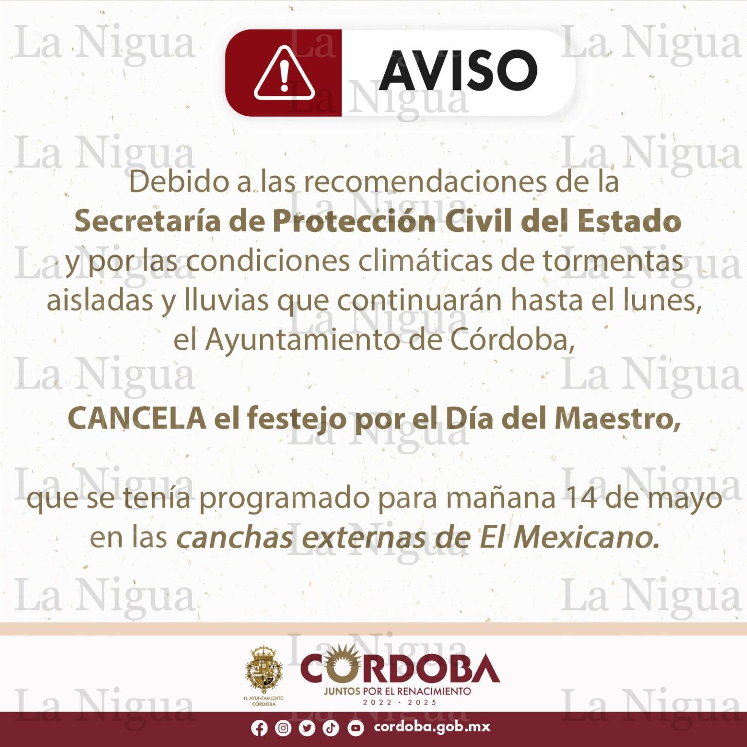Compartir Facebook Twitter LinkedIn Pinterest Email Copy Link Súper Iberia: Tienda en línea El Ayuntamiento de Córdoba informa que debido al pronóstico de lluvias y las recomendaciones emitidas por Protección Civil del Estado queda cancelado el festejo por el Día del Maestro.