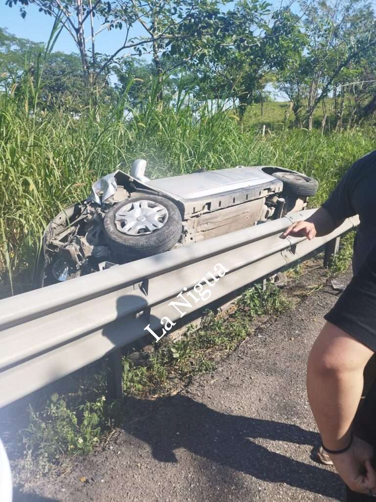 De acuerdo a los primeros reportes, un vehículo que era manejado a exceso de velocidad perdió el control y quedó volcado sobre su costado derecho atrás de una barra metálica de contención, a pesar de lo aparatoso del accidente sus ocupantes solo.fueron atendidos por golpes y no hubo necesidad de ser trasladados un hospital.