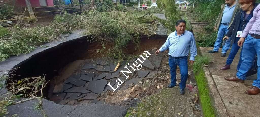 En el lugar menciono que de 3 metros de profundidad que tenía el socavón, según el último reporte de Protección Civil Municipal ya tiene más de 5 metros, lo que indica que sigue creciendo.