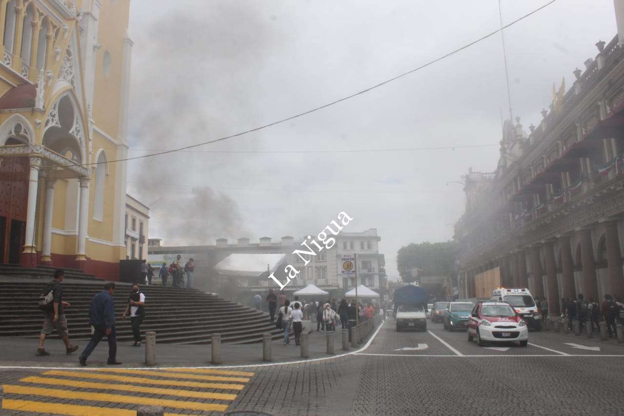 Xalapa, Ver.- Gran susto se llevaron los ciudadanos que caminaban en la Plaza Lerdo de esta ciudad de Xalapa, ya que de repente se empezó a incendiar una planta de energía eléctrica, de inmediato personal de palacio de gobierno, con extinguidores sofocaron el incendio.