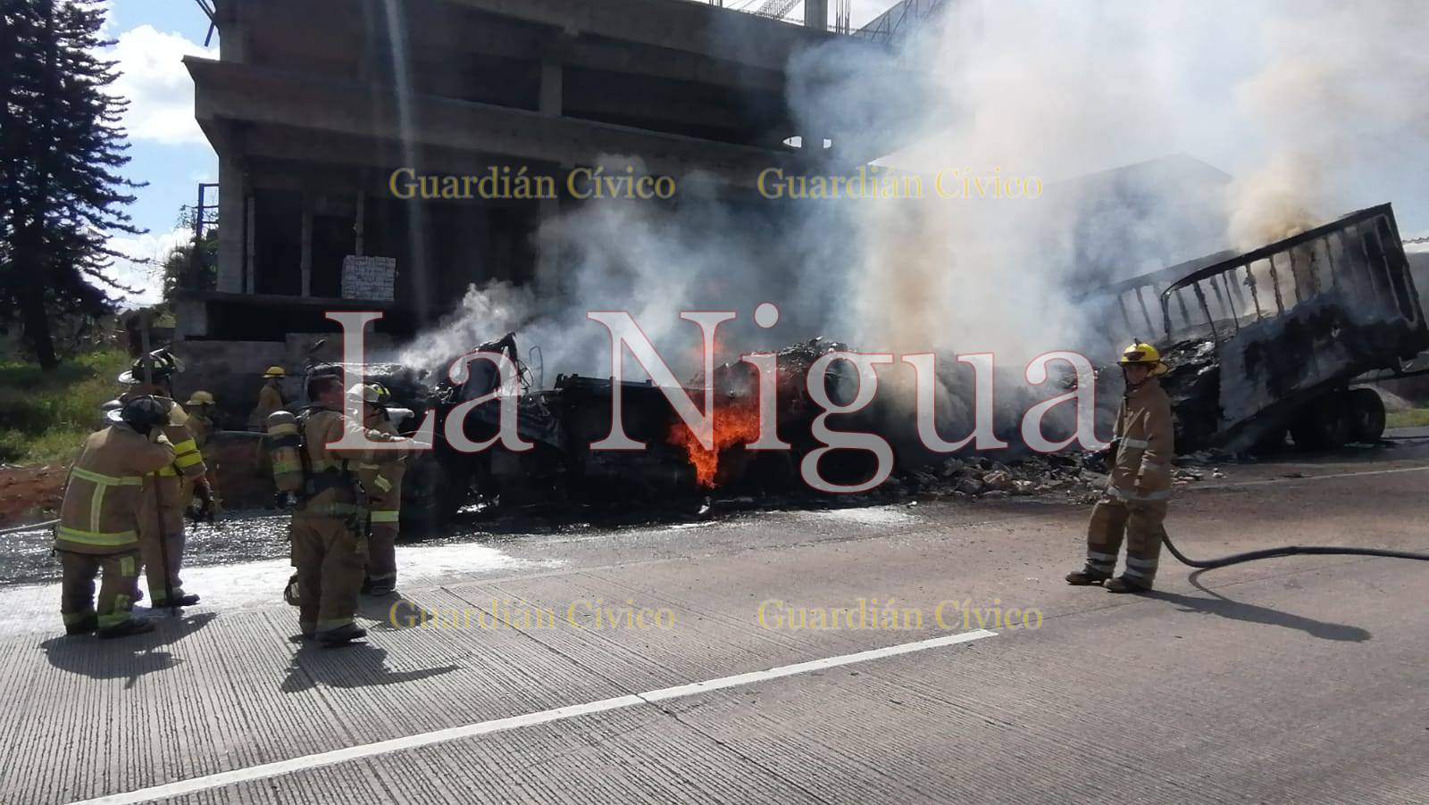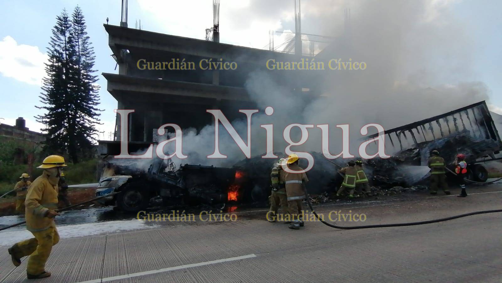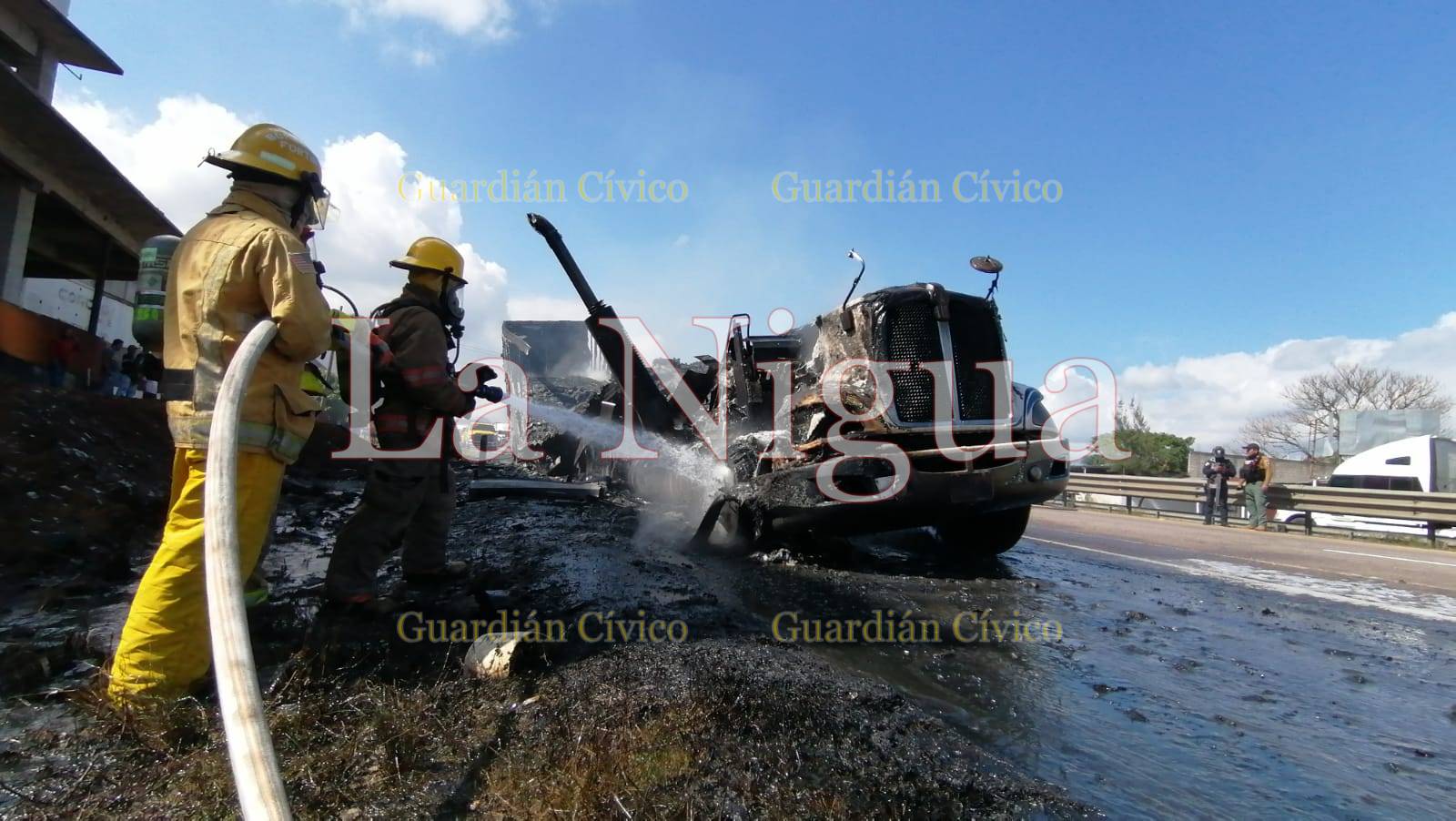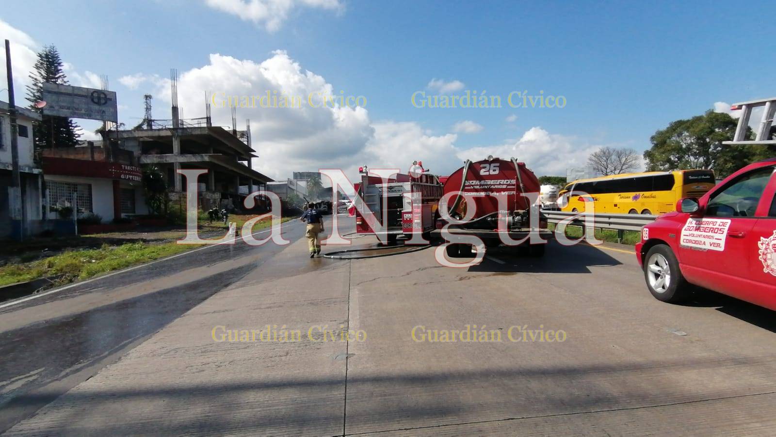 Córdoba.- Este domingo sobre la autopista Orizaba-Córdoba a unos metros del distribuidor vial El Diamante un tráiler terminó incendiándose, dejando daños materiales de consideración.