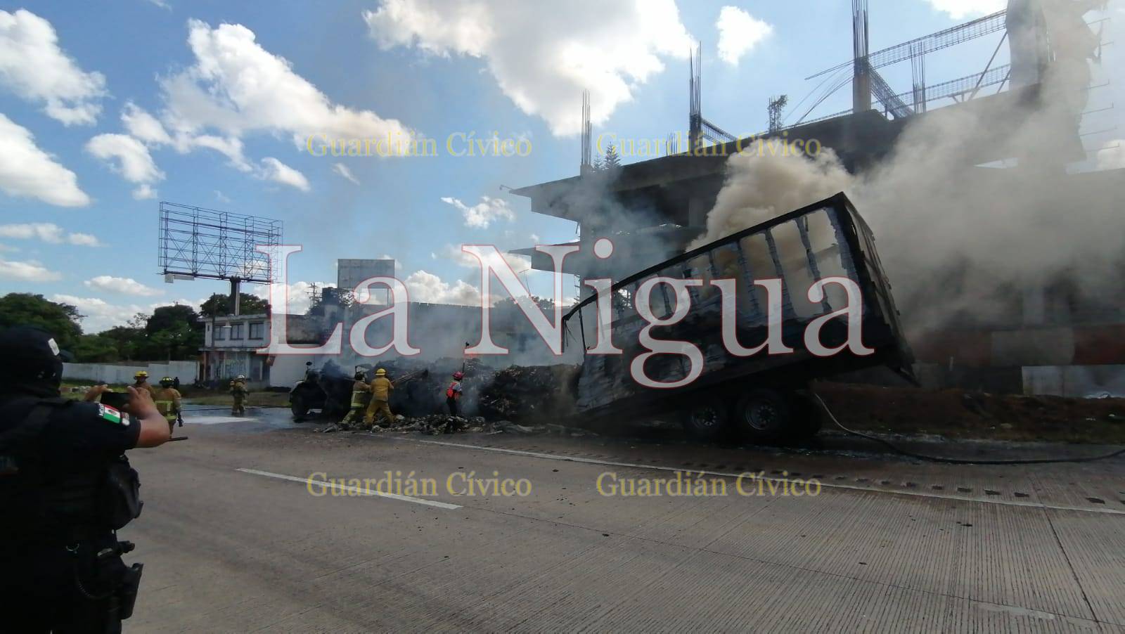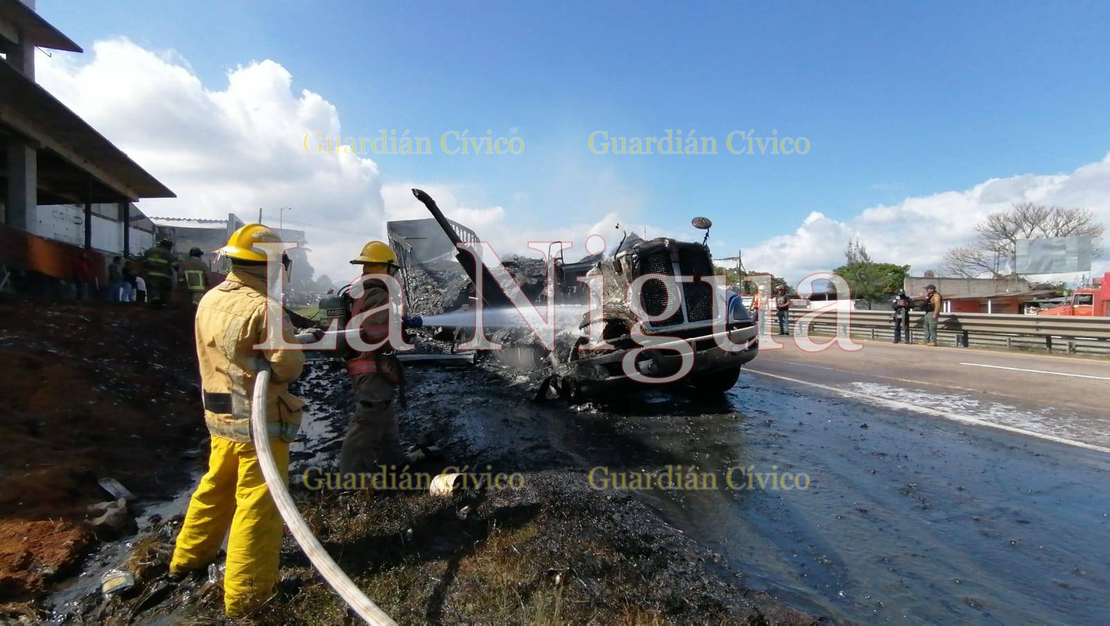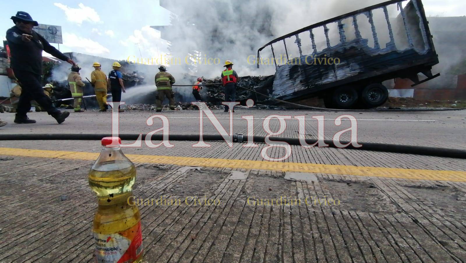 Córdoba.- Este domingo sobre la autopista Orizaba-Córdoba a unos metros del distribuidor vial El Diamante un tráiler terminó incendiándose, dejando daños materiales de consideración.