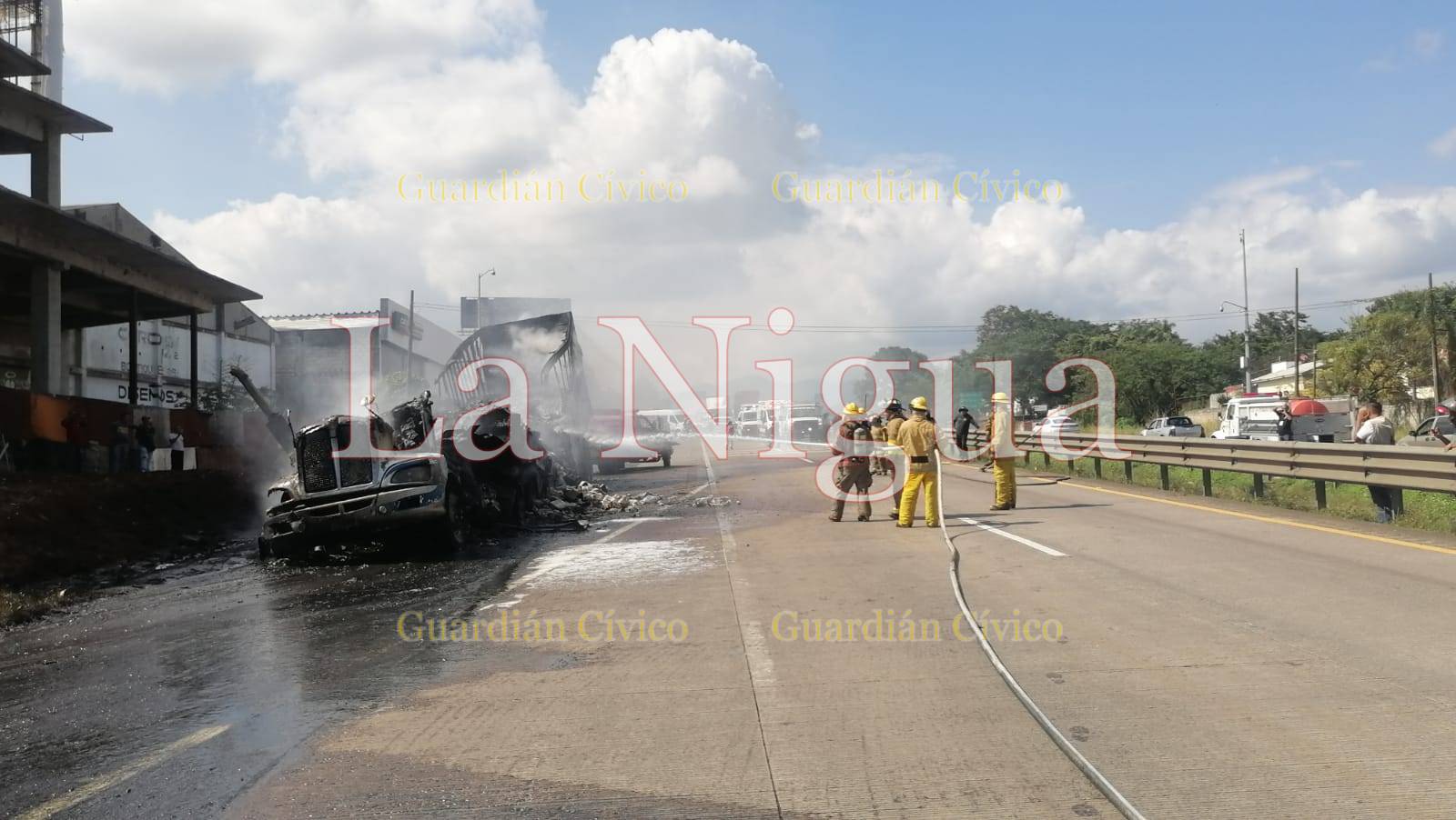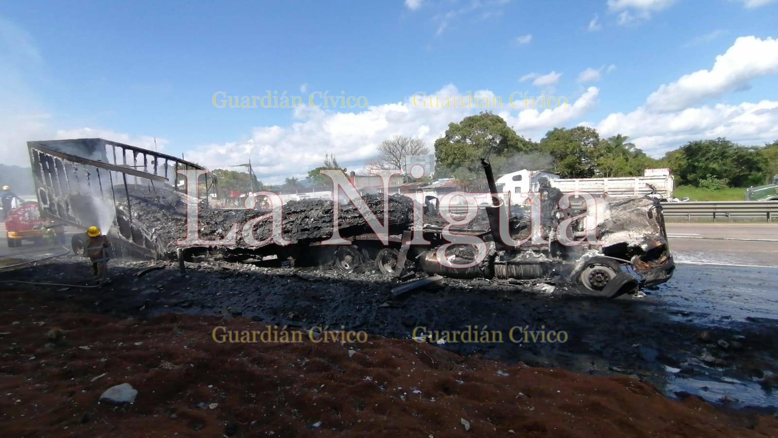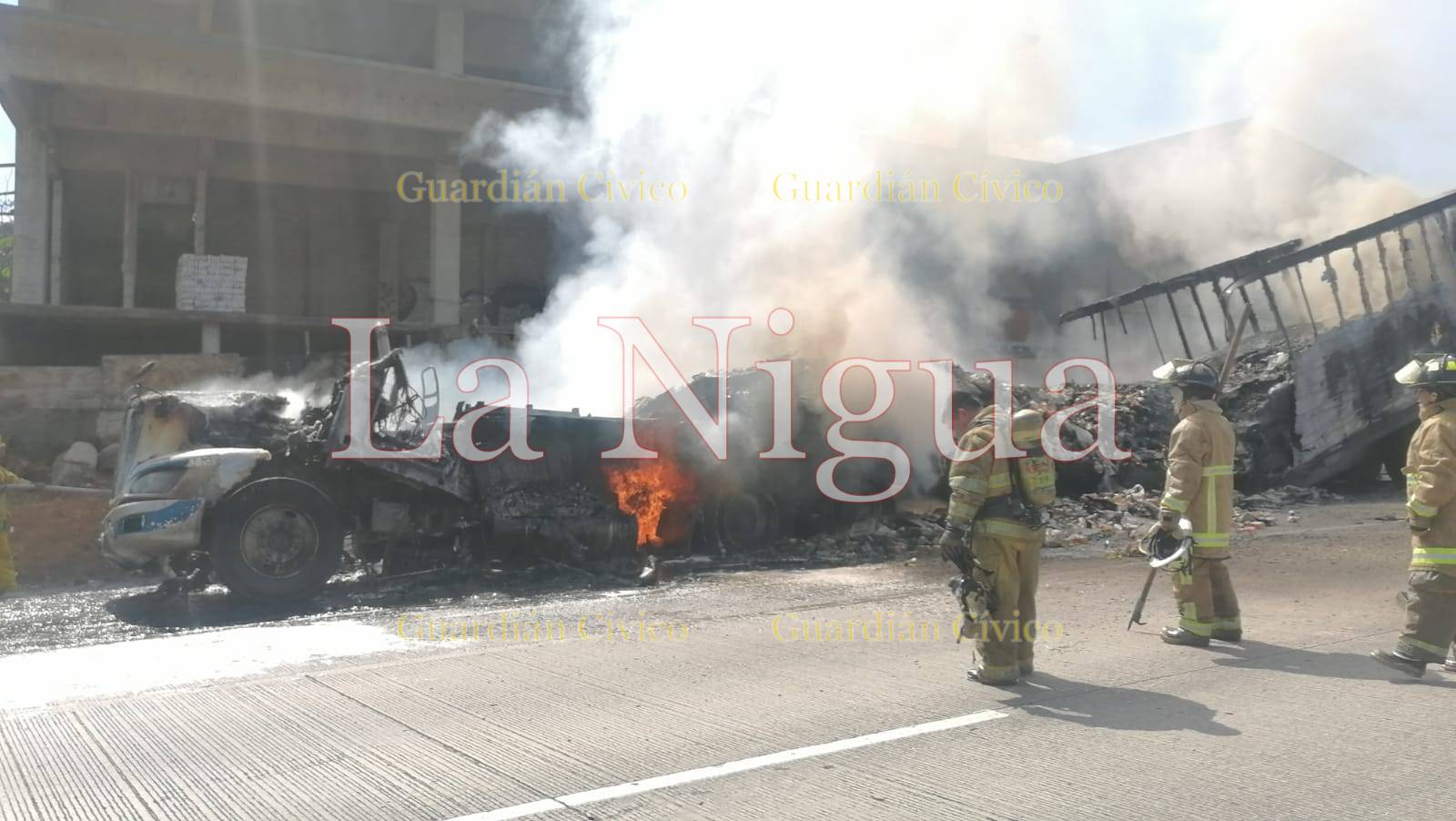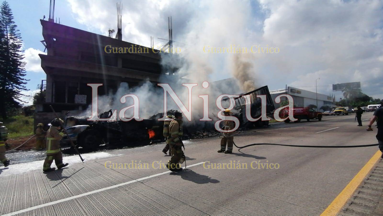 Córdoba.- Este domingo sobre la autopista Orizaba-Córdoba a unos metros del distribuidor vial El Diamante un tráiler terminó incendiándose, dejando daños materiales de consideración.
