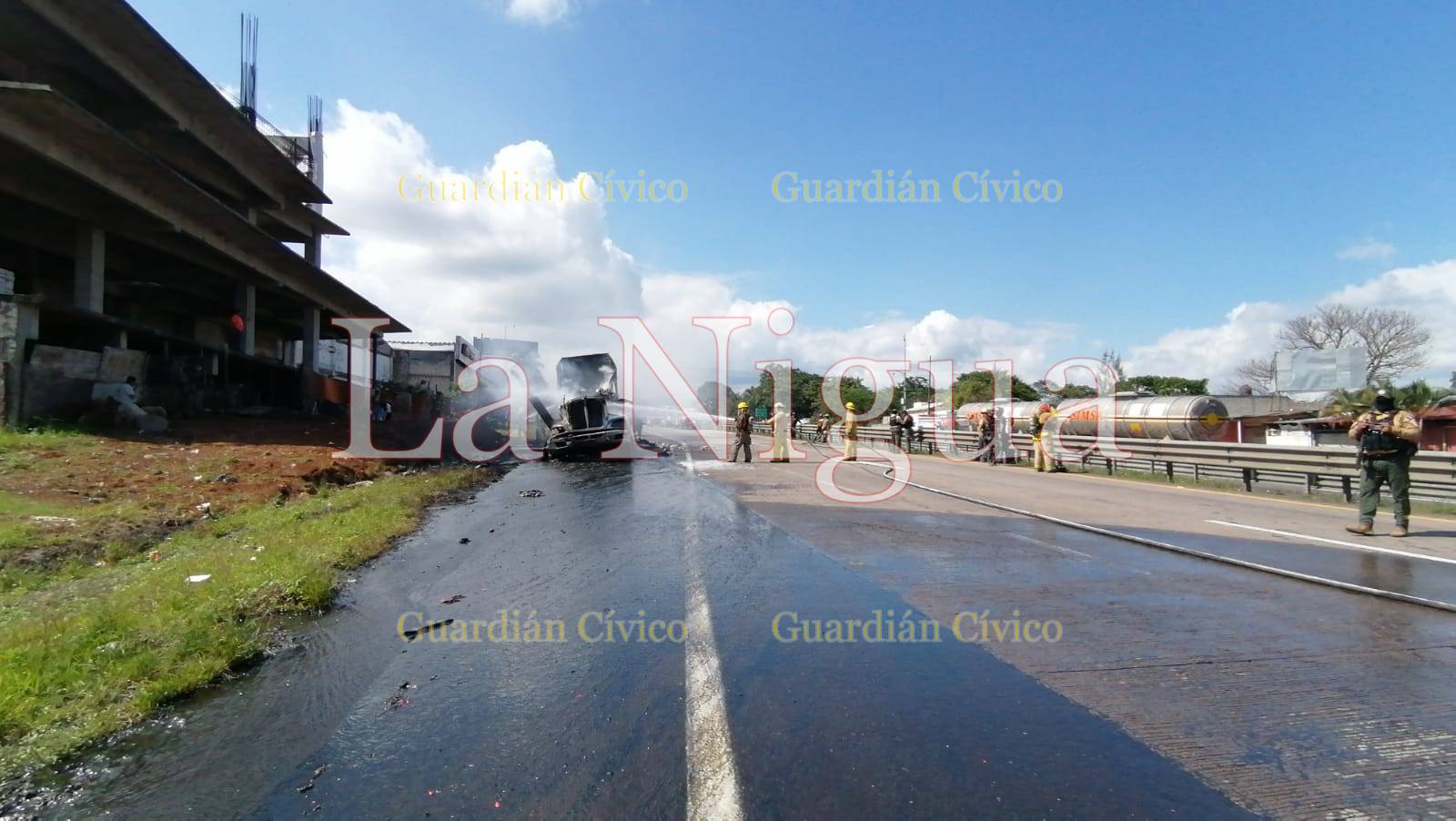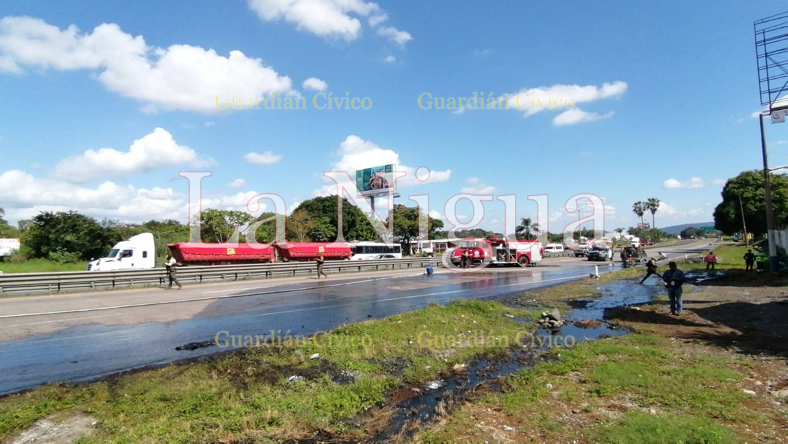 Los hechos se registraron esta tarde en el carril de bajada del kilómetro 291, a unos metros del trébol de la Luz, cuando el tráiler cargado de aceite comestible, tuvo presuntamente una falla mecánica.
