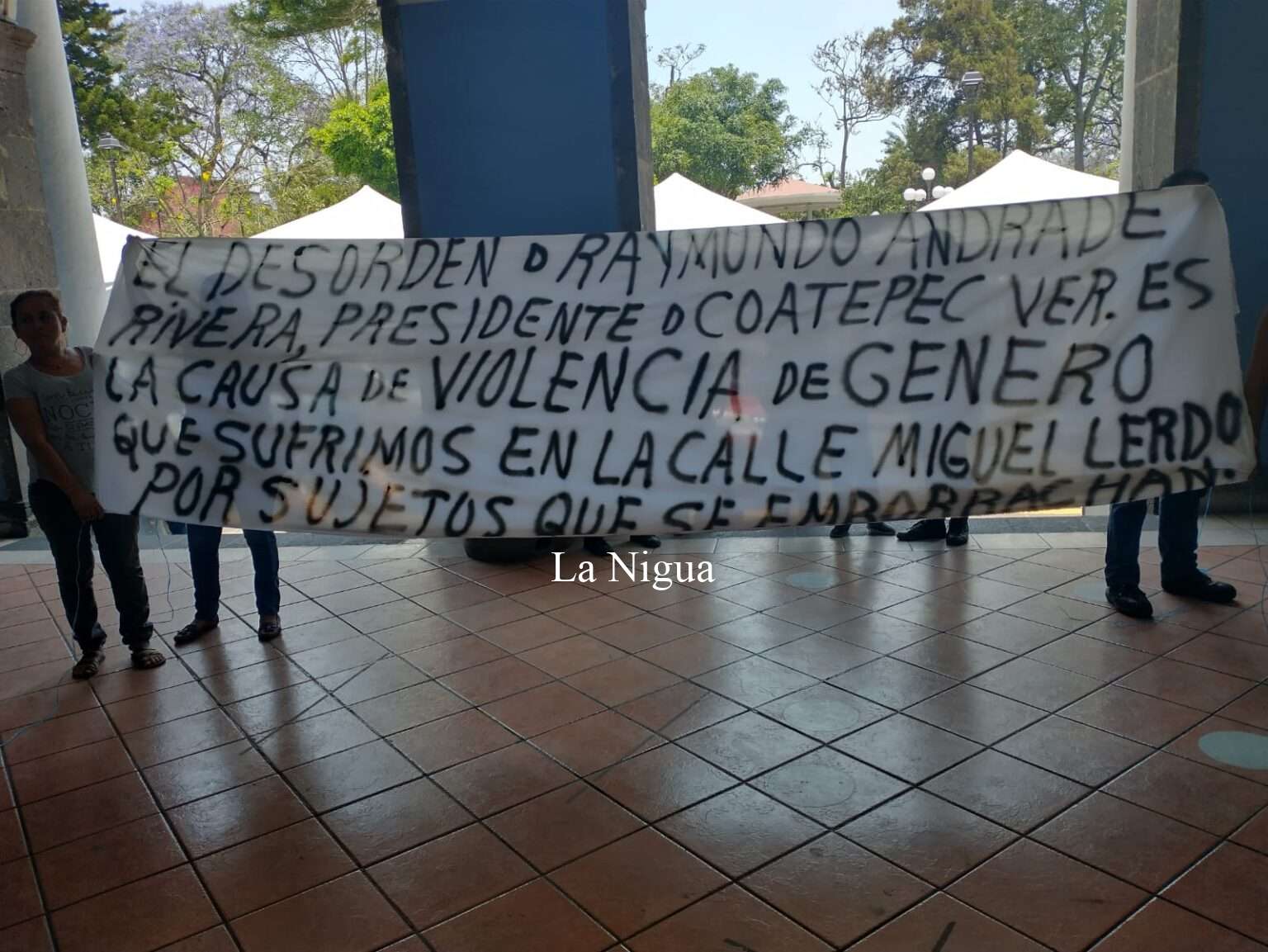 Los manifestantes piden que los reciba el presidente municipal de Coatepec, portan lonas grandes con varias consignas a su petición.