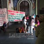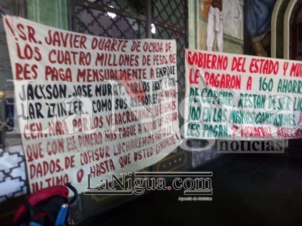 Los manifestantes colocaron dos lonas grandes en el portón principal de palacio de gobierno e indicaron que no se retirarían no ser recibidos por funcionarios de gobierno y les prometan que se le va a devolver sus ahorros.