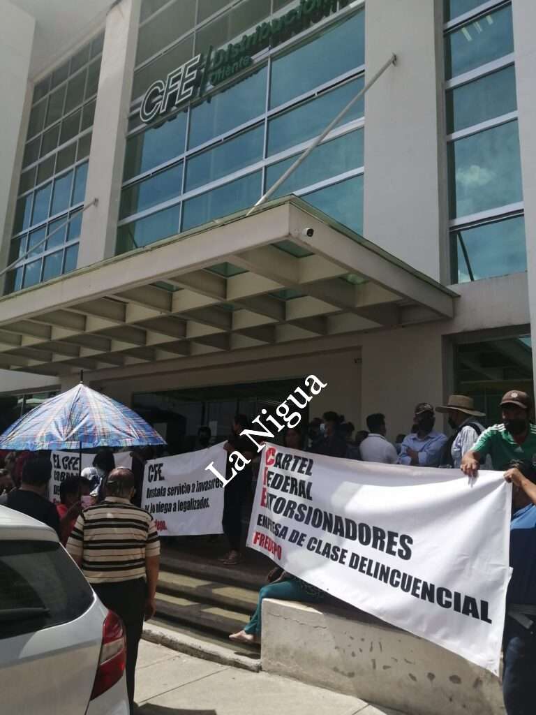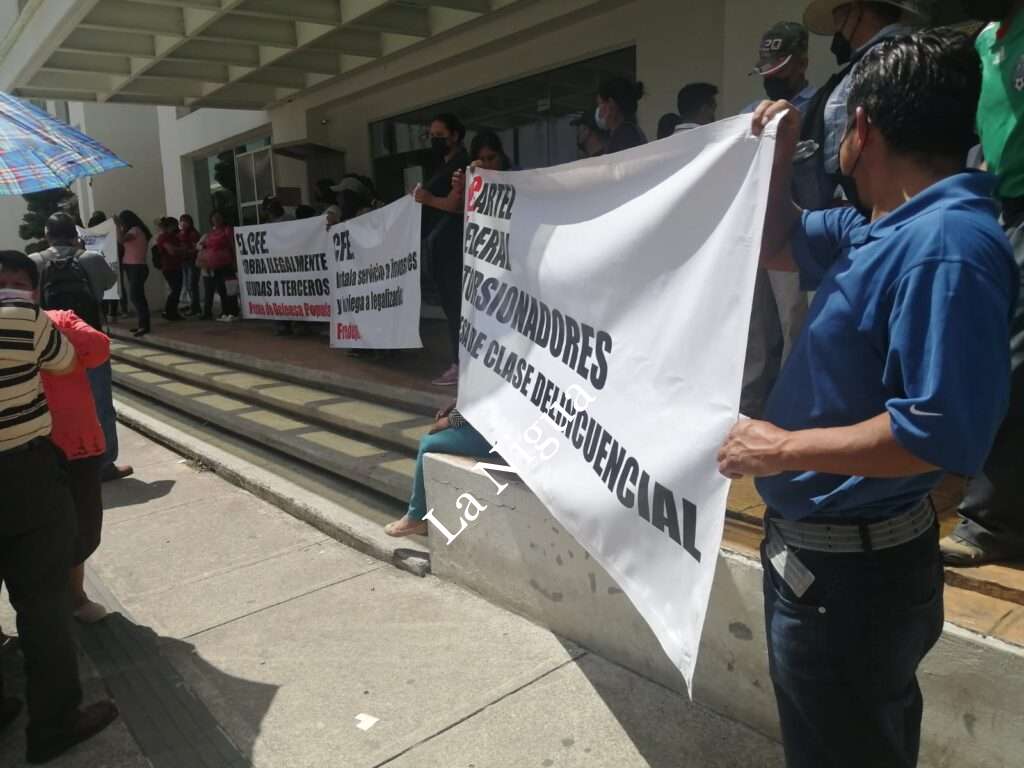 Los manifestantes portaban cartulinas con varias consignas referente a su precisión y por lo tanto no se van a retirar de estas oficinas hasta que sean atendidos por el gerente de Esta división Oriente de esta ciudad de Xalapa