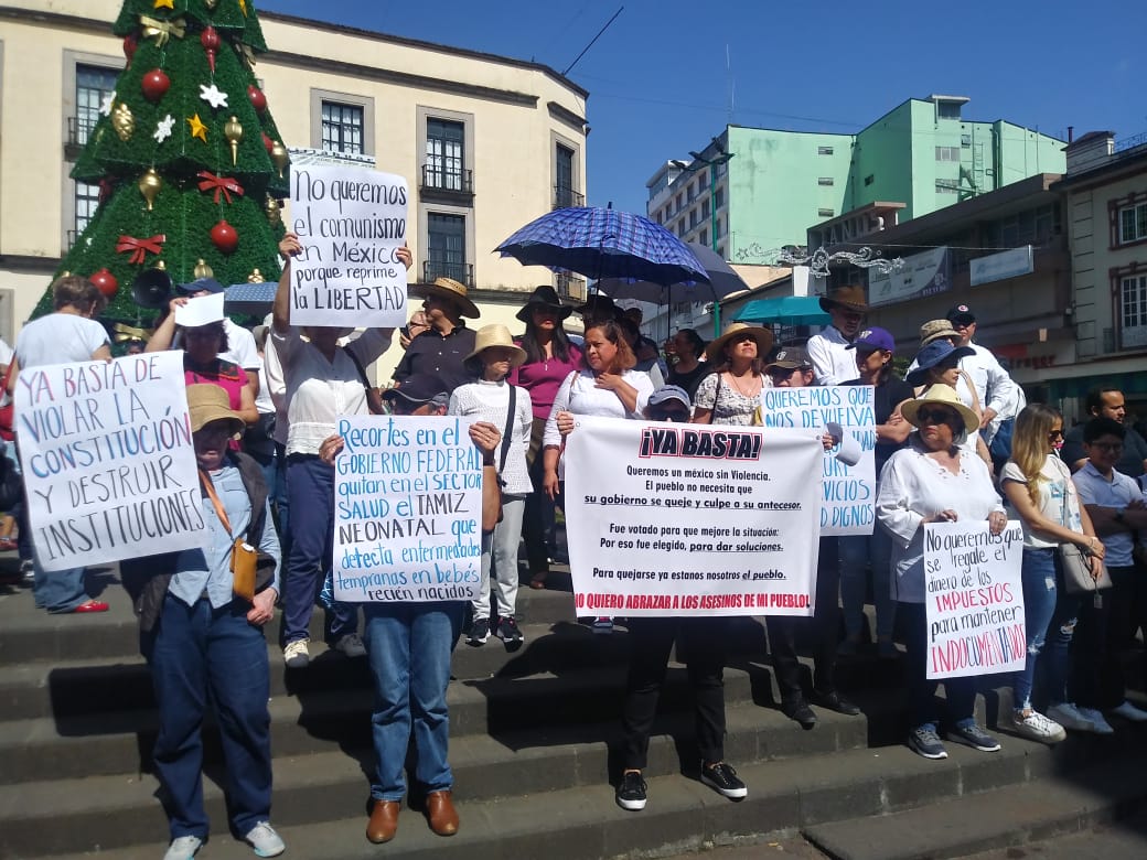 Los manifestantes hicieron uso de un sonido para exponer su inconformidad por las políticas implementados por el gobierno federal, “Queremos que nos devuelva la tranquilidad y restaure los servicios de salud dignos, queremos un México sin violencia”.