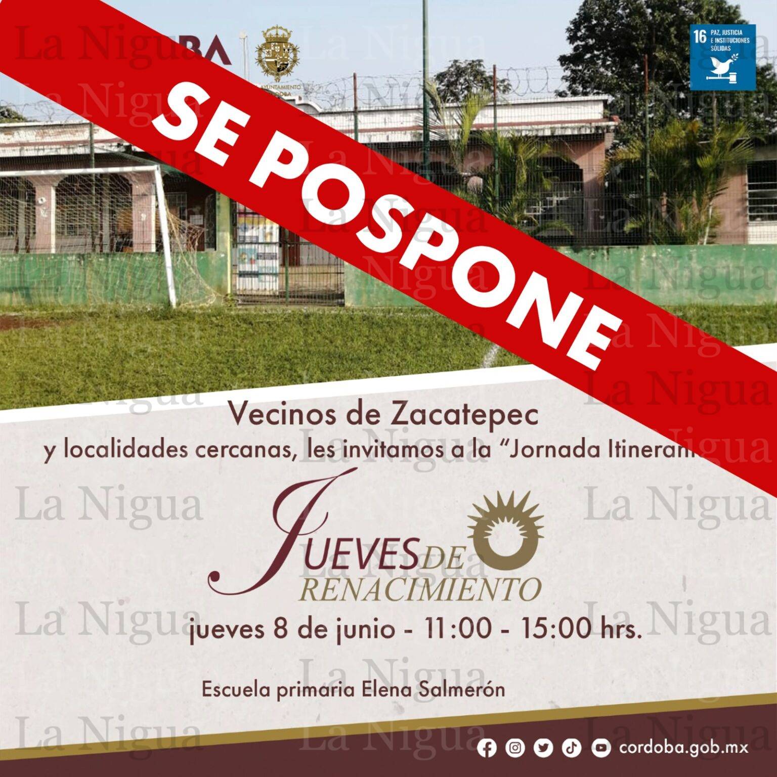 El H. Ayuntamiento de Córdoba pospone por razones de agenda el “Jueves de Renacimiento”, programado para este jueves 8 de junio en Zacatepec, por lo que solicitamos la comprensión de los habitantes de esta localidad, así como de los vecinos de 20 de Noviembre y San José de Tapia.