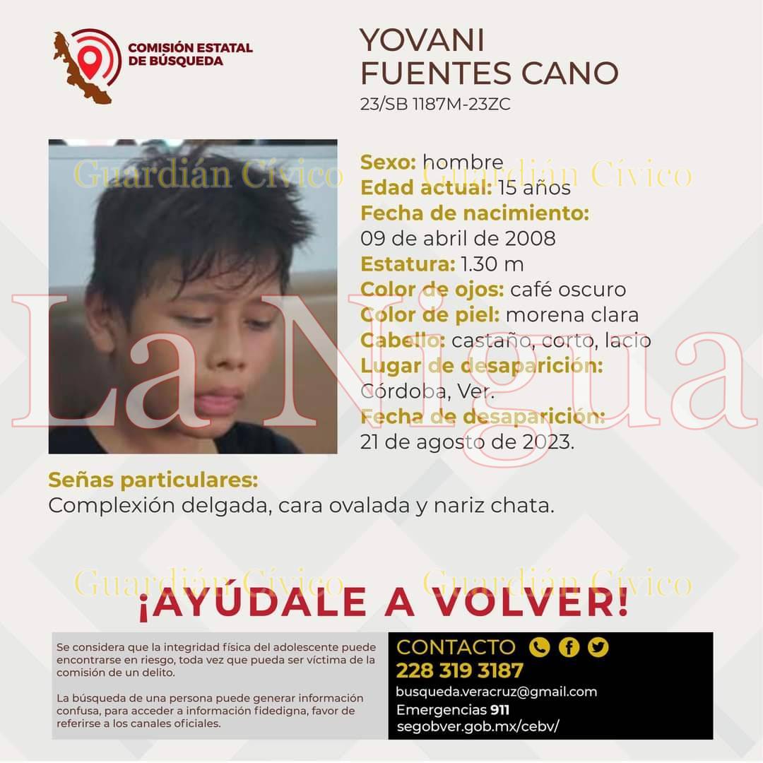 Córdoba, Ver.- A través de la Comisión Estatal de Búsqueda, se han emitido tres fichas de localización debido a que se solicita el apoyo de las autoridades así como de todas las personas para poder dar con el paradero de Yonavi Fuentes Escano, así como también de José Ángel Moreno Arias, ambos de 15 años de edad, desaparecidos en Córdoba, mientras que Biliulfo Martínez Morales, de 41 años de edad, es reportado como desaparecido en el municipio de Tomatlán.