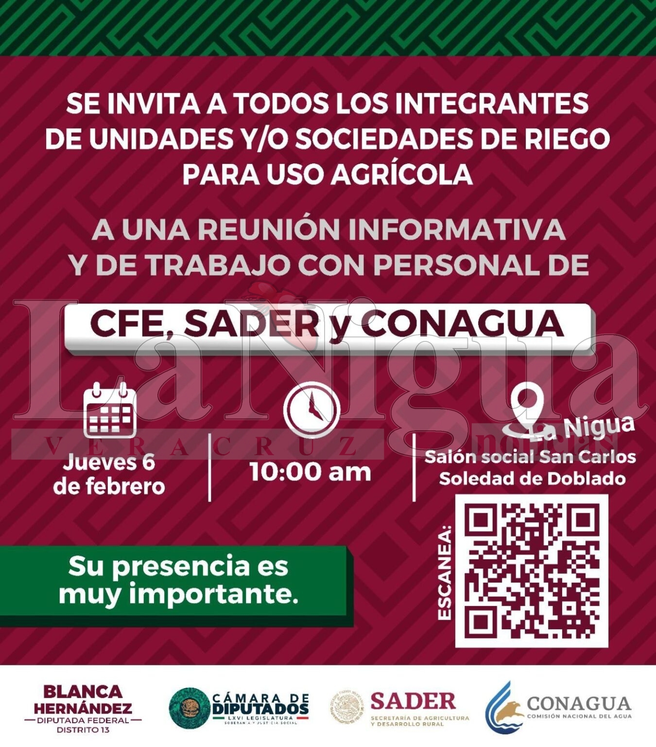 SOLEDAD DE DOBLADO, VER.- Luego de reuniones previas con la diputada Blanca Hernández y comisionados de CFE, para enterarse del problema que atraviesan más de 400 unidades de riego, luego de que la Secretaría de Agricultura (Sader ) dejara de pagar a la Comisión Federal de Electricidad el subsidio del 70 por ciento de consumo, por un “reajuste” tarifario del 2023, que llegó con cuentas impagables de hasta 585 mil pesos por pozo, este jueves 6 de febrero, se llevará a cabo una reunión general, con decenas de representantes de Unidades de riego de la zona seca de Veracruz que comprenden Camarón, Paso del Macho, Carrillo Puerto, Cotaxtla, Soledad de Doblado y Cardel, La Antigua.