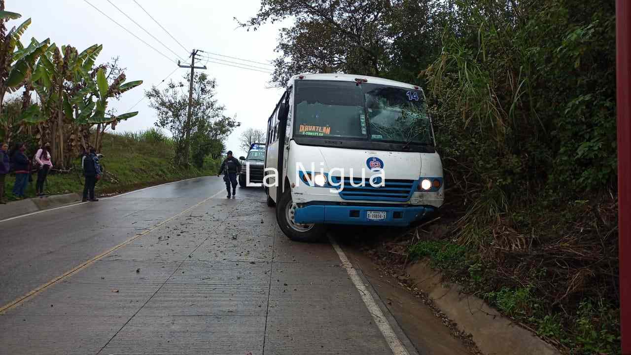 Tomatlán. Tremendo susto se llevaron pasajeros de un autobús qué cubre la ruta Tomatlán a #Ixhuatlán, cuando el vehículo en que viajaban derrapó, trepó la cuneta y quedó detenido en un bordo, el incidente se presentó la mañana del miércoles a la altura de Las Compras, afortunadamente el percance no dejó personas lesionadas.