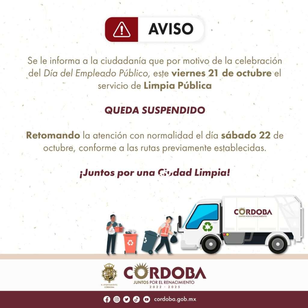 Compartir Facebook Twitter LinkedIn Pinterest Email Copy Link Súper Iberia: Tienda en línea Córdoba, Ver.- Respetando los derechos laborales de los trabajadores, el servicio de Limpia Pública suspenderá sus actividades este viernes 21 de octubre, retomando sus actividades de manera normal el día sábado 22 de octubre.