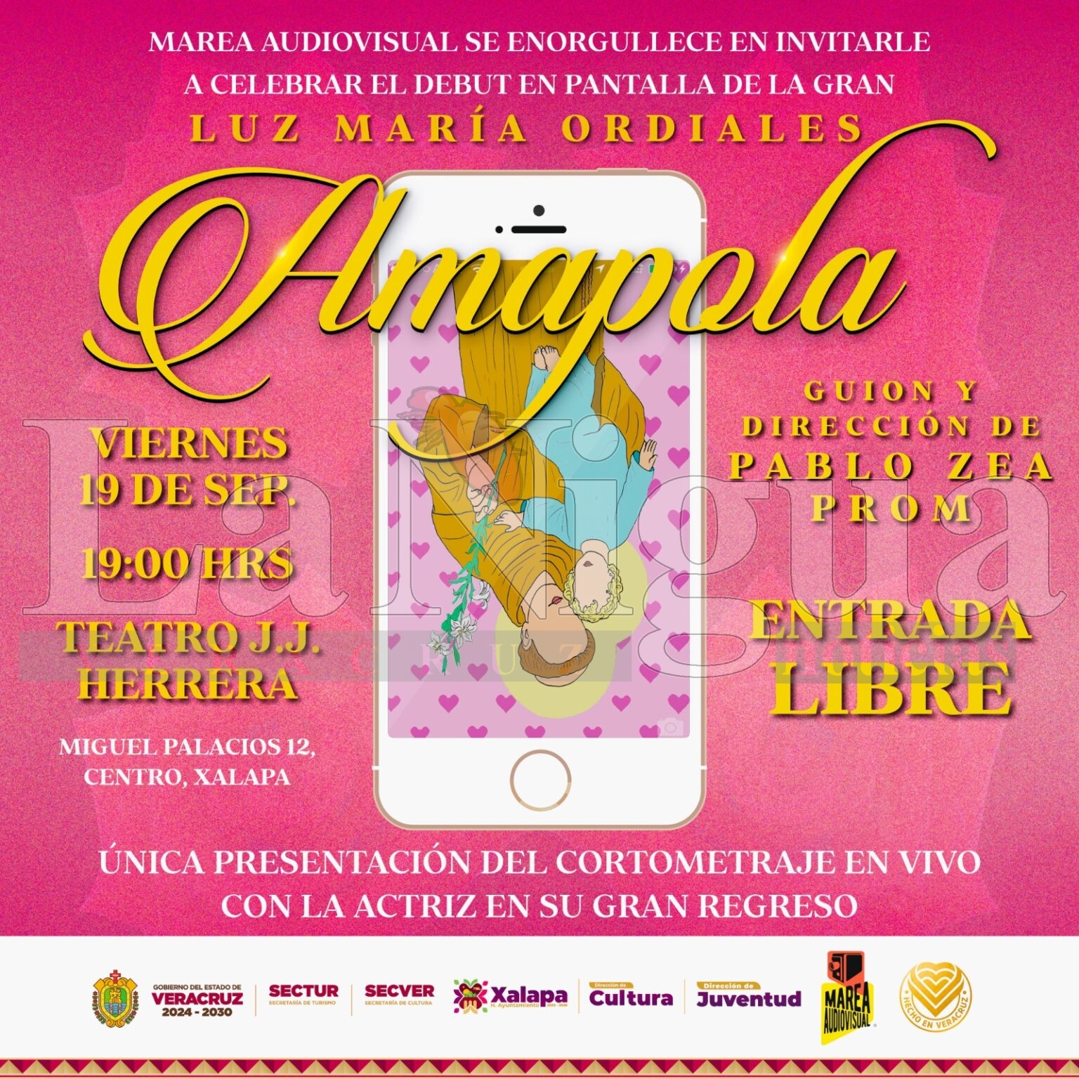 Xalapa, Ver., jueves 18 de septiembre de 2025.- Las secretarías de Cultura y de Turismo, en coordinación con el Ayuntamiento de Xalapa, invitan a la presentación del cortometraje Amapola, este viernes a las 19:00 horas, en el Teatro J.J. Herrera de esta ciudad. La entrada es gratuita.