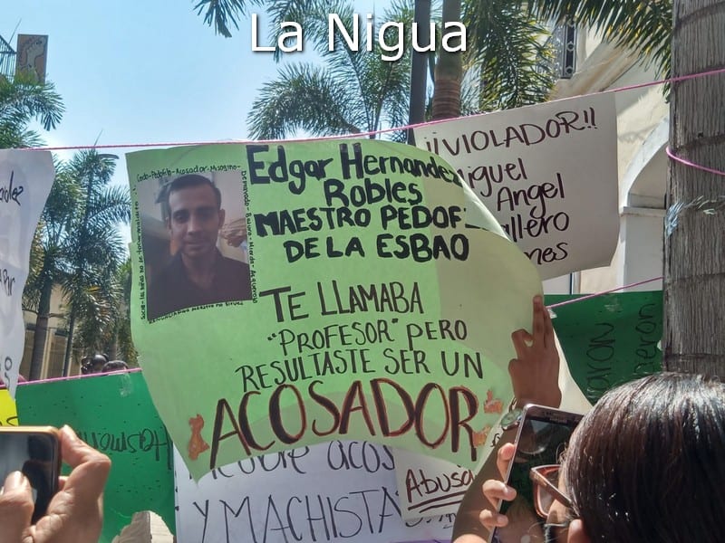 “Te llamabas profesor, pero resultaste acosador”, “Édgar Hernández Robles, profesor pedófilo de la Esbao”, se leía en las cartulinas con fotografía del maestro que mostraban las jóvenes.
