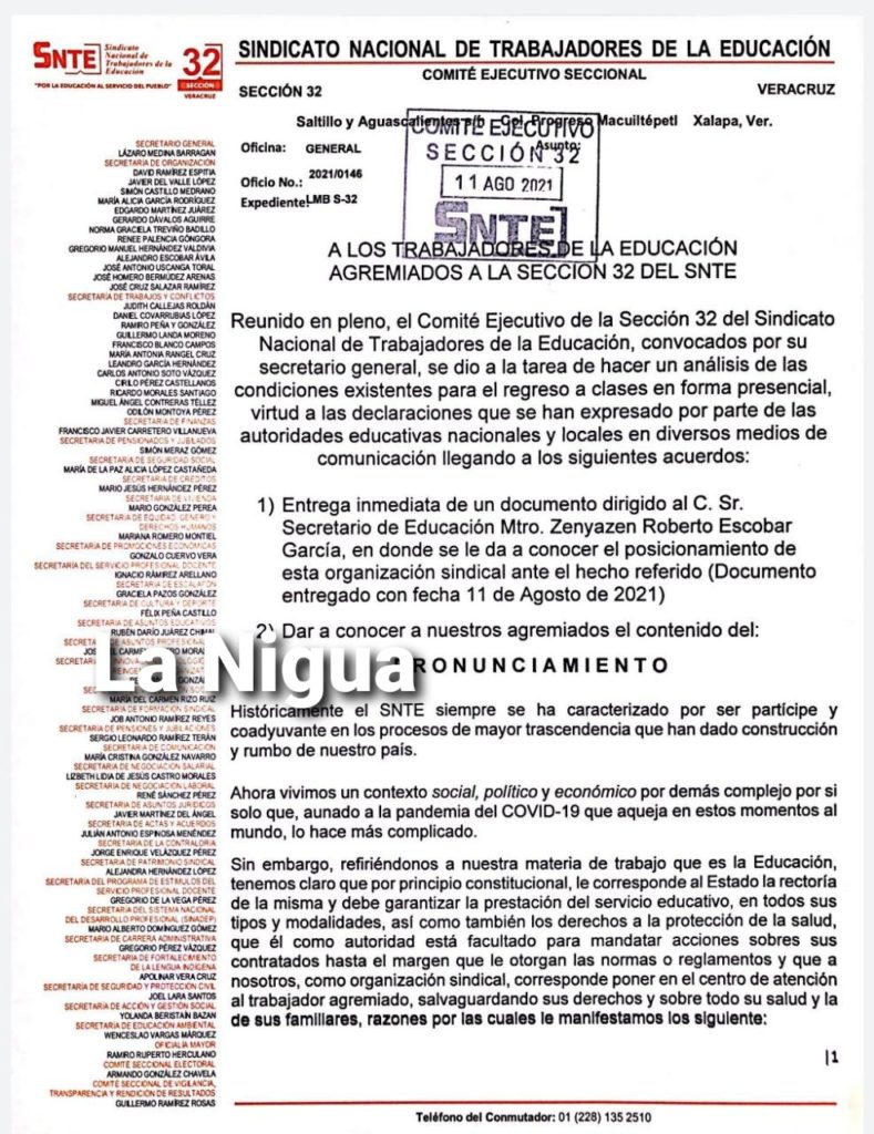En un pronunciamiento dirigido a los agremiados de esta organización magisterial, que se derivó de la reunión en pleno del Comité Ejecutivo de la Sección 32 del SNTE, en donde se hizo un análisis de las condiciones existentes para el regreso a clases en forma presencial, entregaron un documento al titular de Educación de Veracruz, Zenyazen Roberto Escobar García, en donde se fija el posicionamiento de la organización magisterial y que fuera entregado con fecha 11 de agosto del año en curso, lo anterior, en virtud de las declaraciones expresadas por parte de las autoridades educativas nacionales y locales en diversos medios de comunicación, en donde se ratifica su compromiso por preservar los principios del artículo 3° Constitucional y la defensa de la Educación Pública, pero sobre todo velar por la certidumbre laboral y salarial de los trabajadores.