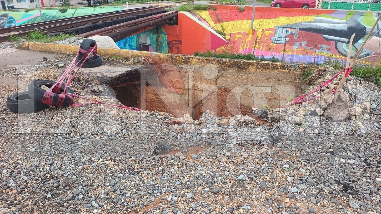 Cosoleacaque, Ver. — Un socavón localizado en las inmediaciones del puente de La Bomba mantiene en riesgo latente a automovilistas y trabajadores, ante el temor de que continúe creciendo en dimensiones y termine por comprometer la seguridad vial y la infraestructura ferroviaria de la zona.