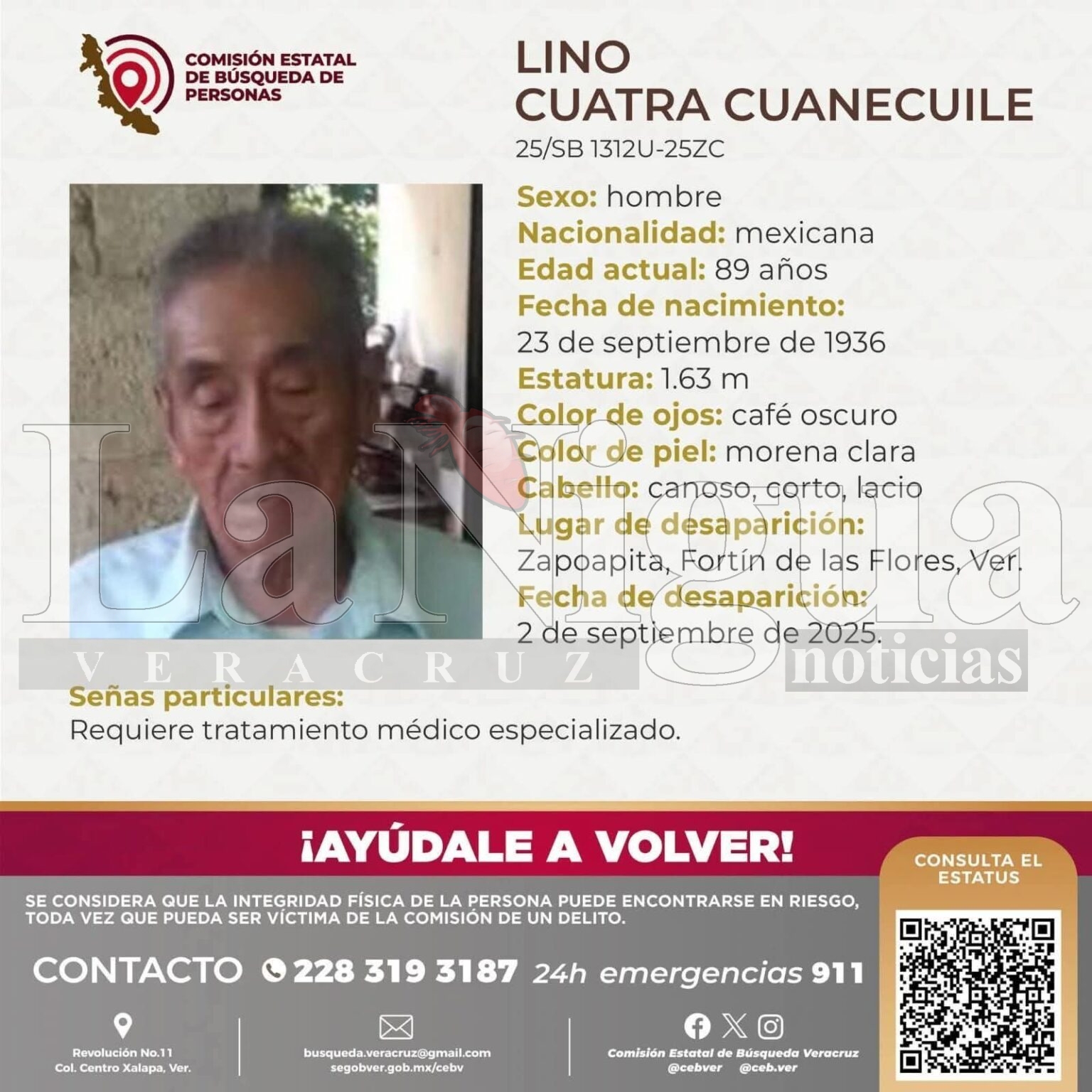 Fortín, Ver.– Familiares y amistades del señor Lino Cuatra Cuanecuile, de 89 años de edad, solicitan el apoyo de la ciudadanía en general, así como de las autoridades de los tres niveles de gobierno, para lograr su pronta localización, luego de que perdieran todo tipo de contacto con él desde el día martes.