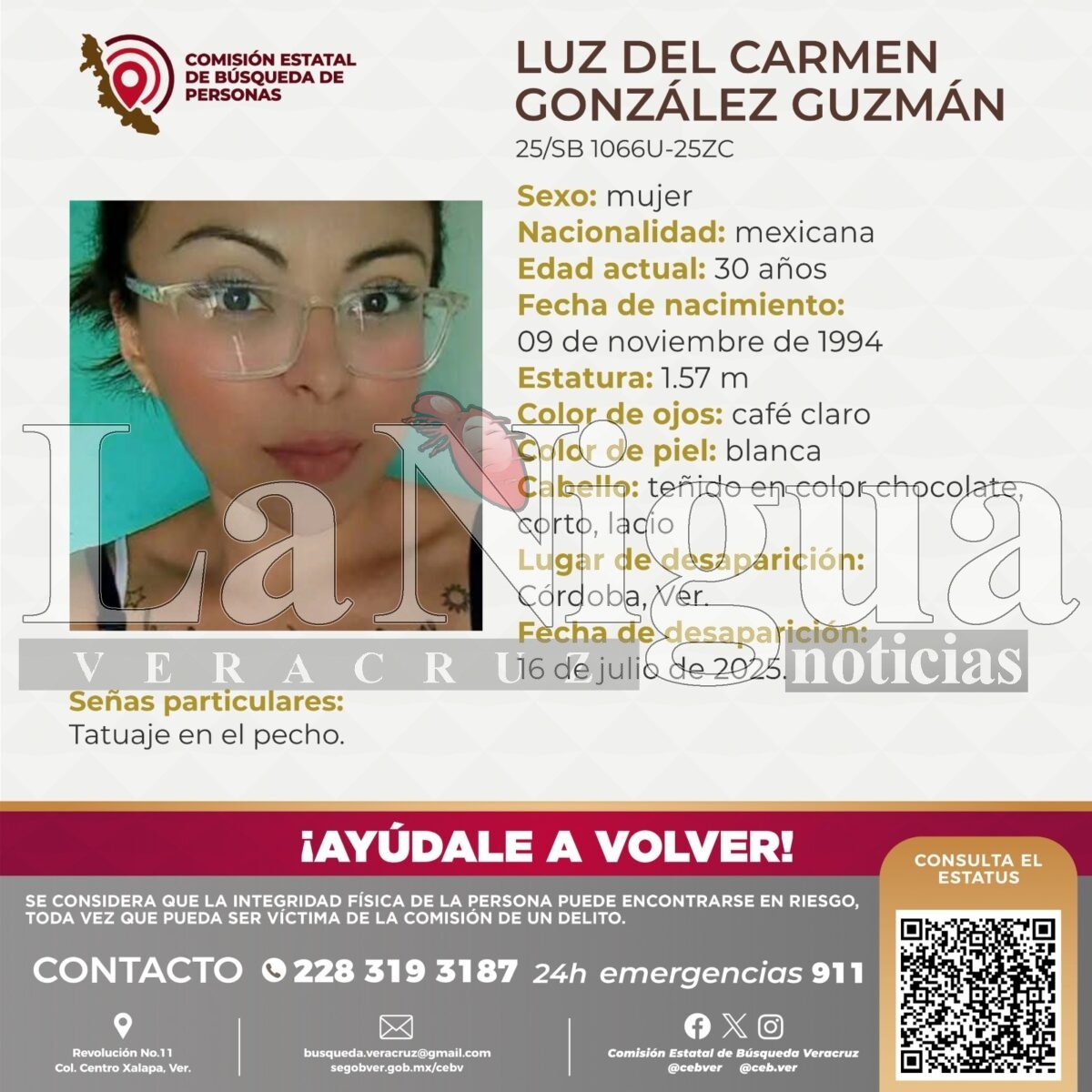 Córdoba, Ver.- Se solicita la colaboración de la comunidad para dar con el paradero de una joven desaparecida desde el pasado miércoles 16 de julio de 2025. Hasta la fecha, sus familiares no han tenido noticias sobre su ubicación o estado.