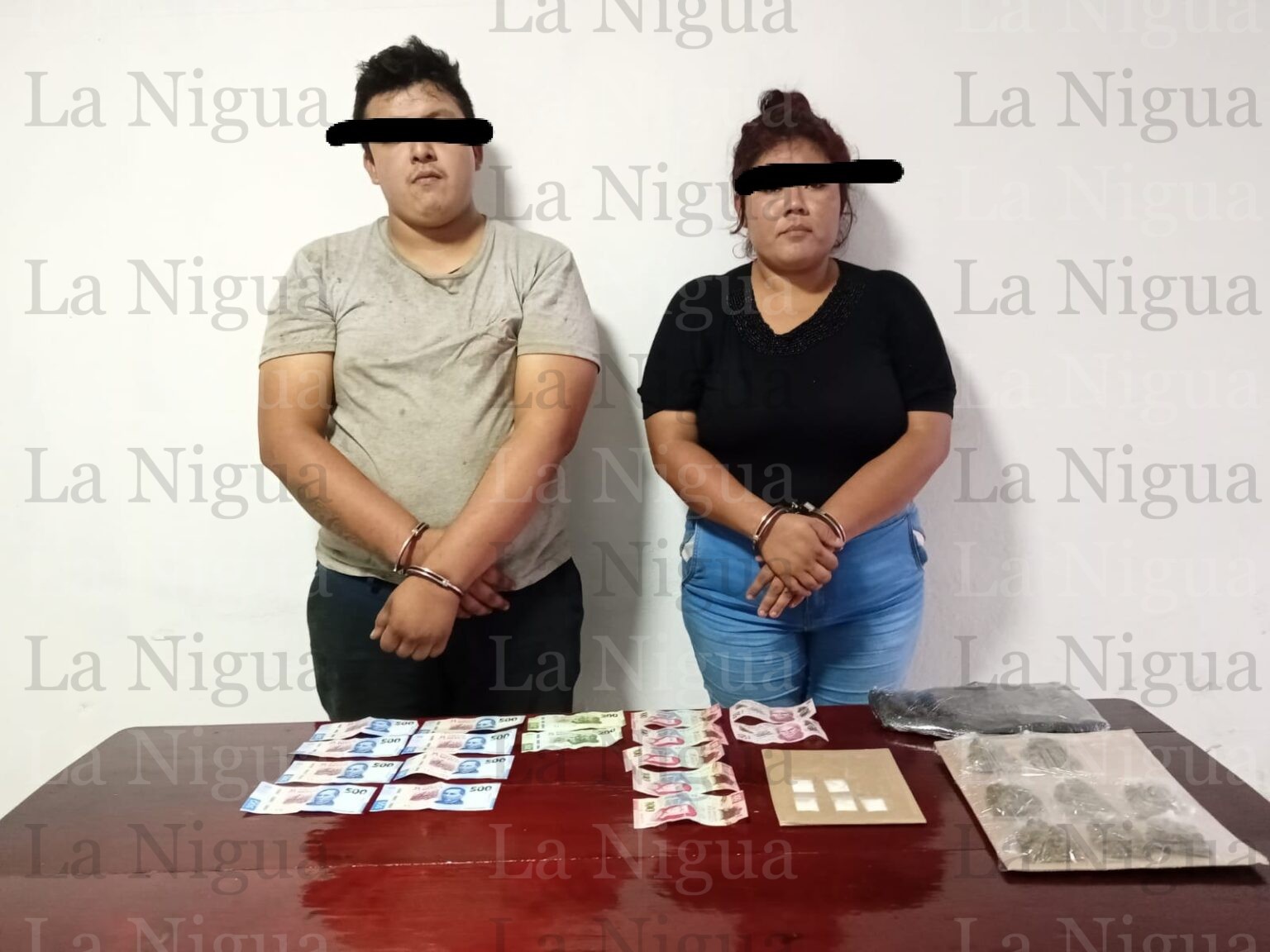 De acuerdo a información recabada, los hechos ocurrieron la noche de ayer sábado en el camino conduce a la comunidad de Ceiba Blanca donde elementos de la policía estatal realizaban labores de prevención del delito, le hicieron el alto aún vehiculo Vento, Volkswagen, color arena donde en su interior viajaban una pareja que al hacer una revisión en una mariconera encontraron bolsitas con características de sustancias conocidas como marihuana y cristal.