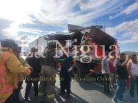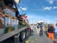 La colisión se registró cuando el camión de pasajeros se impactó de frente en la parte posterior de un camion tipo quinta Rueda que transportaba cajas de cartón de una empresa cervecera