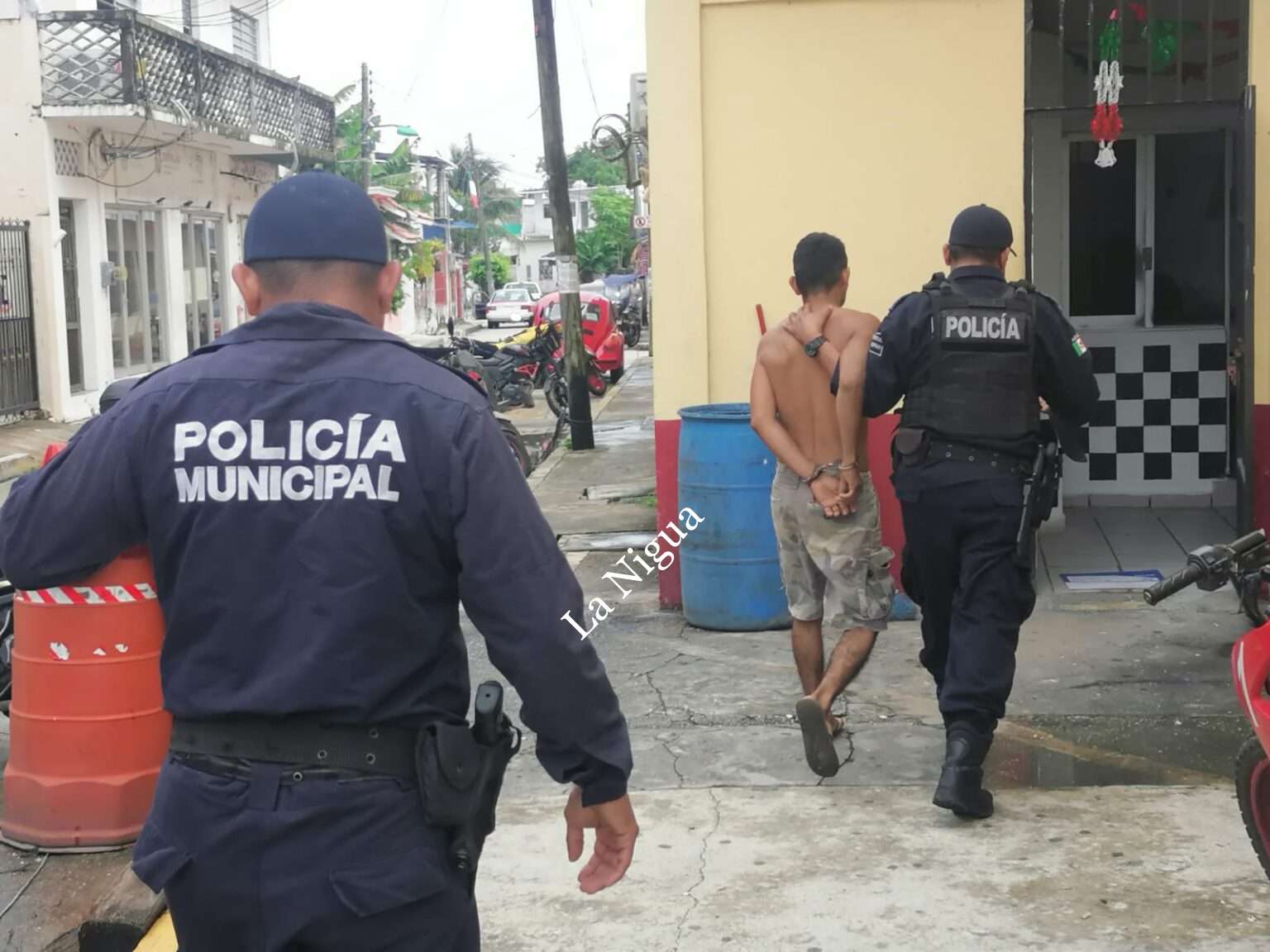 Elementos de la policía municipal a cargo del Comandante Rubén Esquivel García, acudieron al llamado de auxilio de los vecinos de la calle Romero de la Colonia Tancochapa que reportaban que un sujeto al parecer bajo los influjos de alguna droga, intentaba machetear a su pareja.