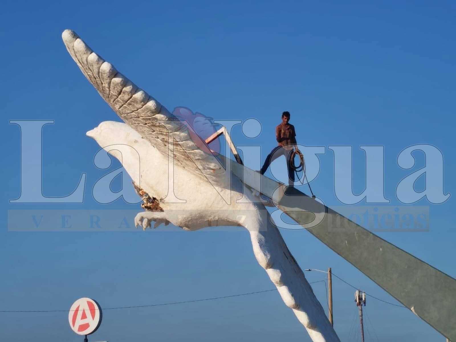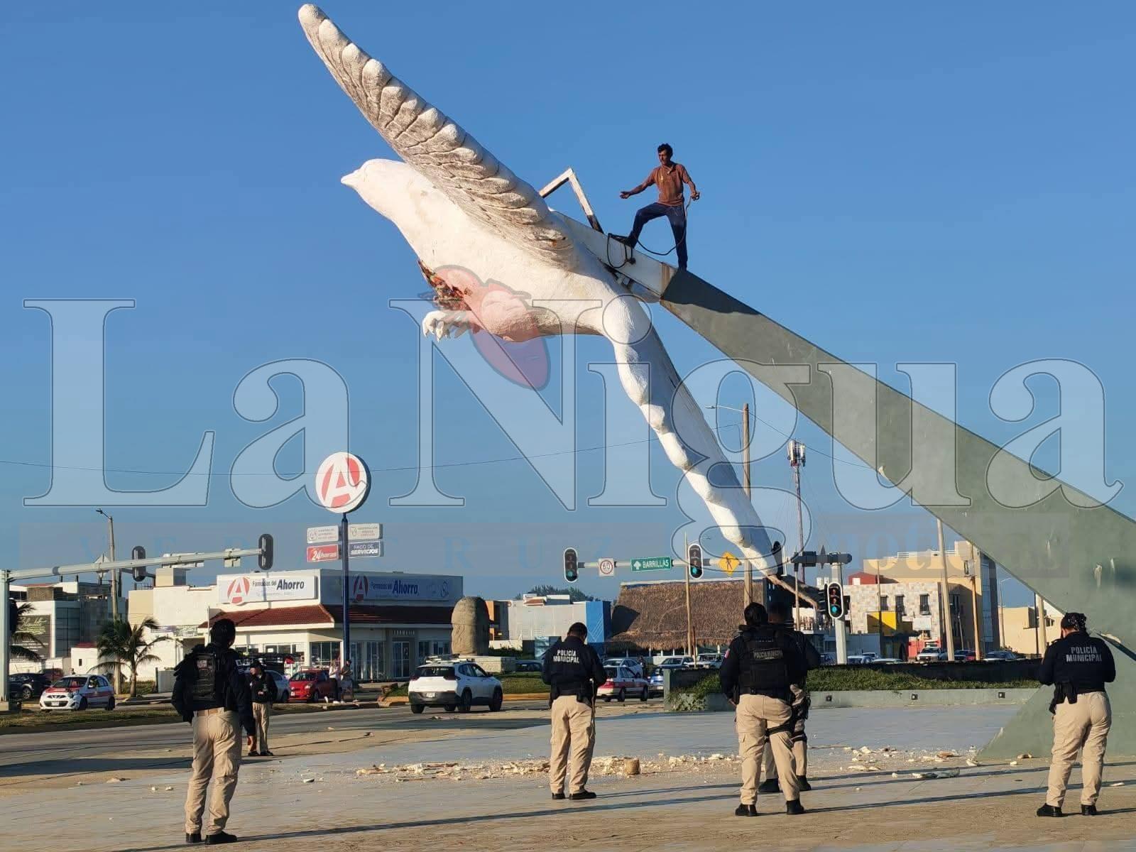 Coatzacoalcos, Ver.- Un masculino que presuntamente actuaba bajo los efectos de algún tóxico, subio a la Paloma de la Paz de la Plaza del Espíritu Santo, presuntamente intentaba m4t4r3 y le causó daños.